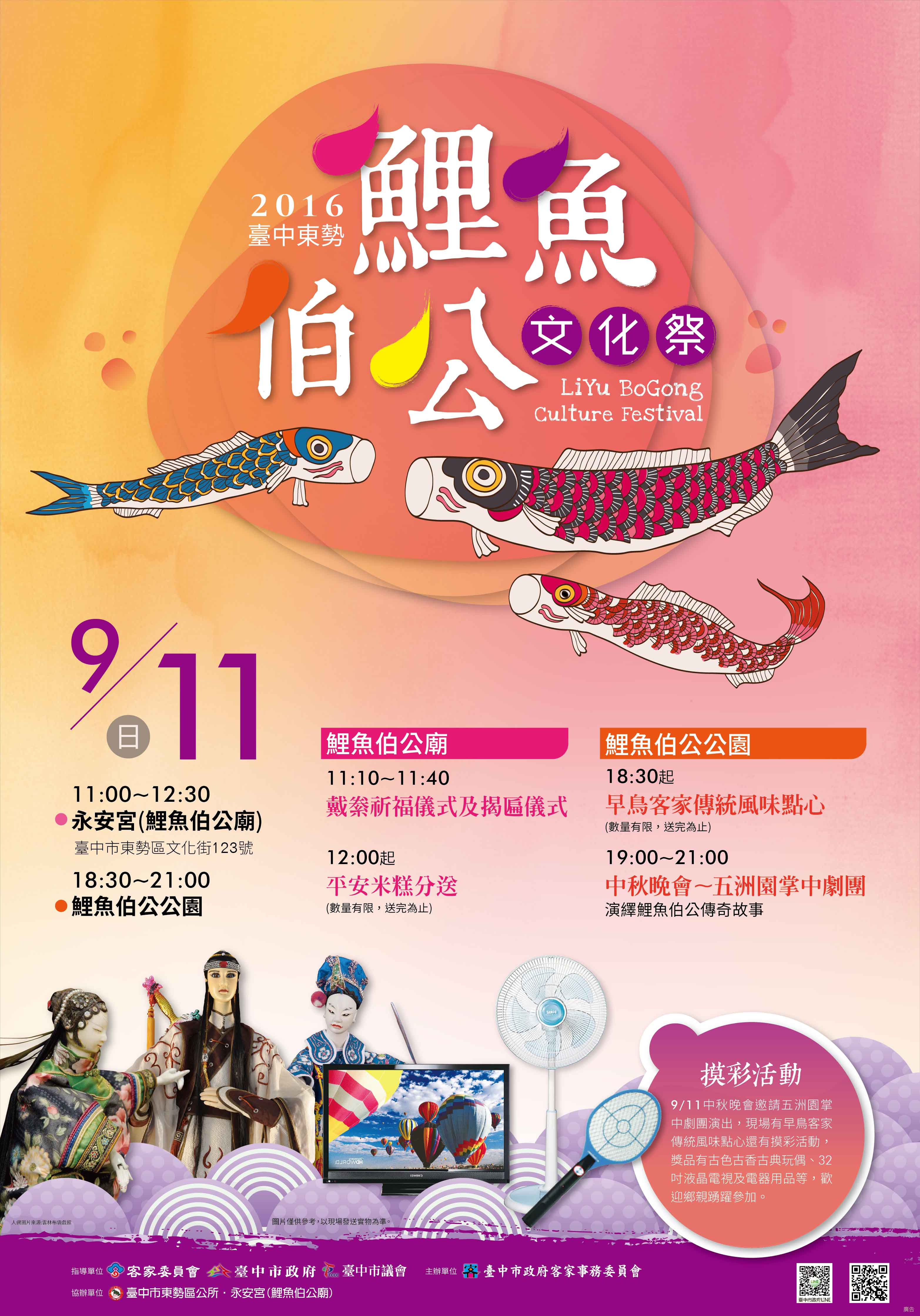 「2016台中東勢鯉魚伯公文化祭」,將於週日(11日)在鯉魚伯公廟登場,今年活動現場將製作大型鯉魚造型米糕及平安米糕,會後與大家分享,山城舞獅團也將帶來精彩表演;而晚間18時30分還有五洲園掌中劇團在鯉魚伯公公園,演繹鯉魚伯公的傳奇故事,更有摸彩活動並提供客家傳統風味點心,歡迎大家在初秋夜晚共襄盛舉!