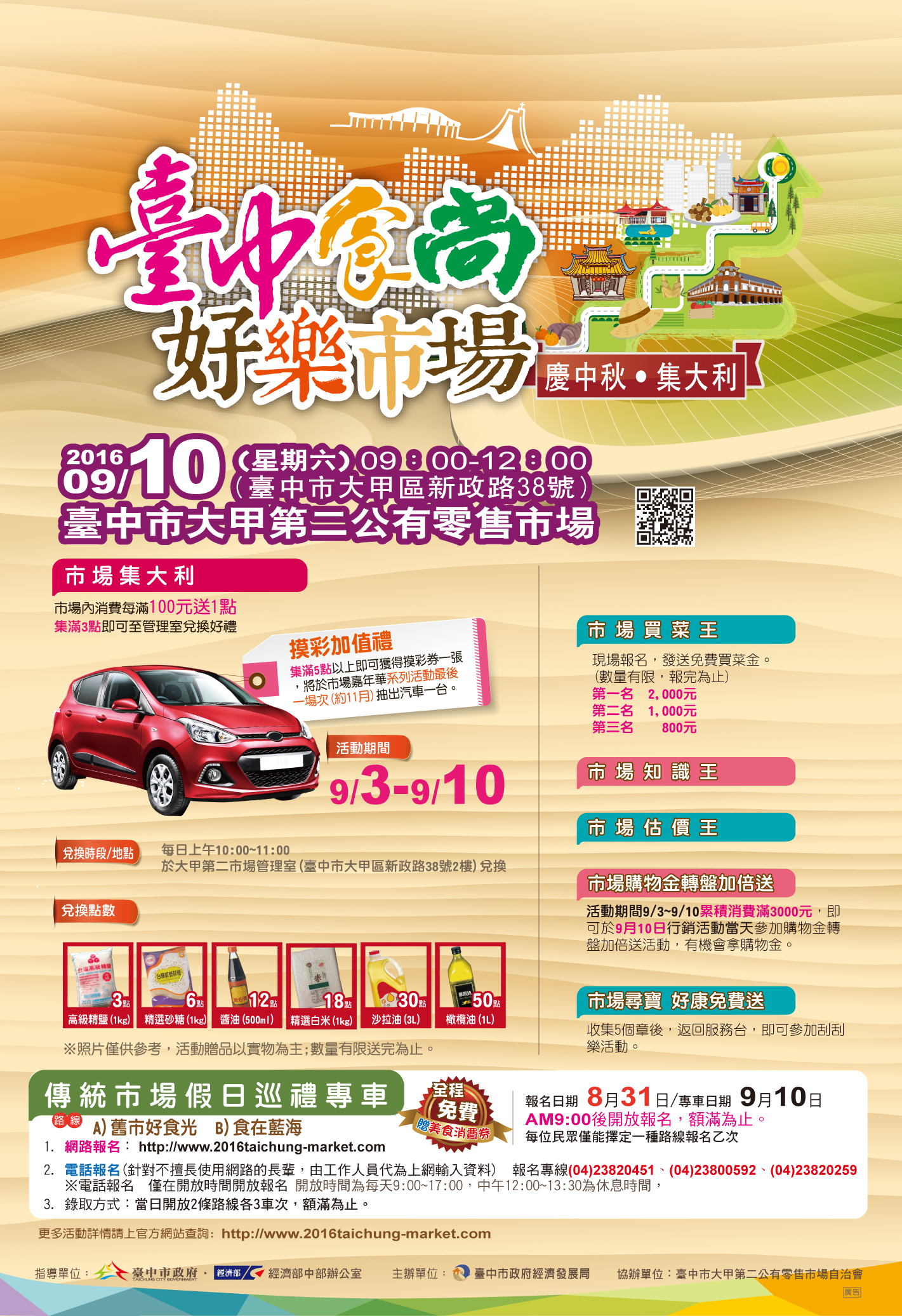9/10(六)上午9時至12時,邀您到大甲第二公有零售市場一同參與「台中食尚 好樂市場-慶中秋‧集大利行銷活動」,現場免費品嚐市場特色美食,還有機會參與11月的抽汽車大獎活動,其他豐富活動內容包括:市場尋寶好康送、買菜王競賽、知識王擂台賽、購物金轉盤加倍送!