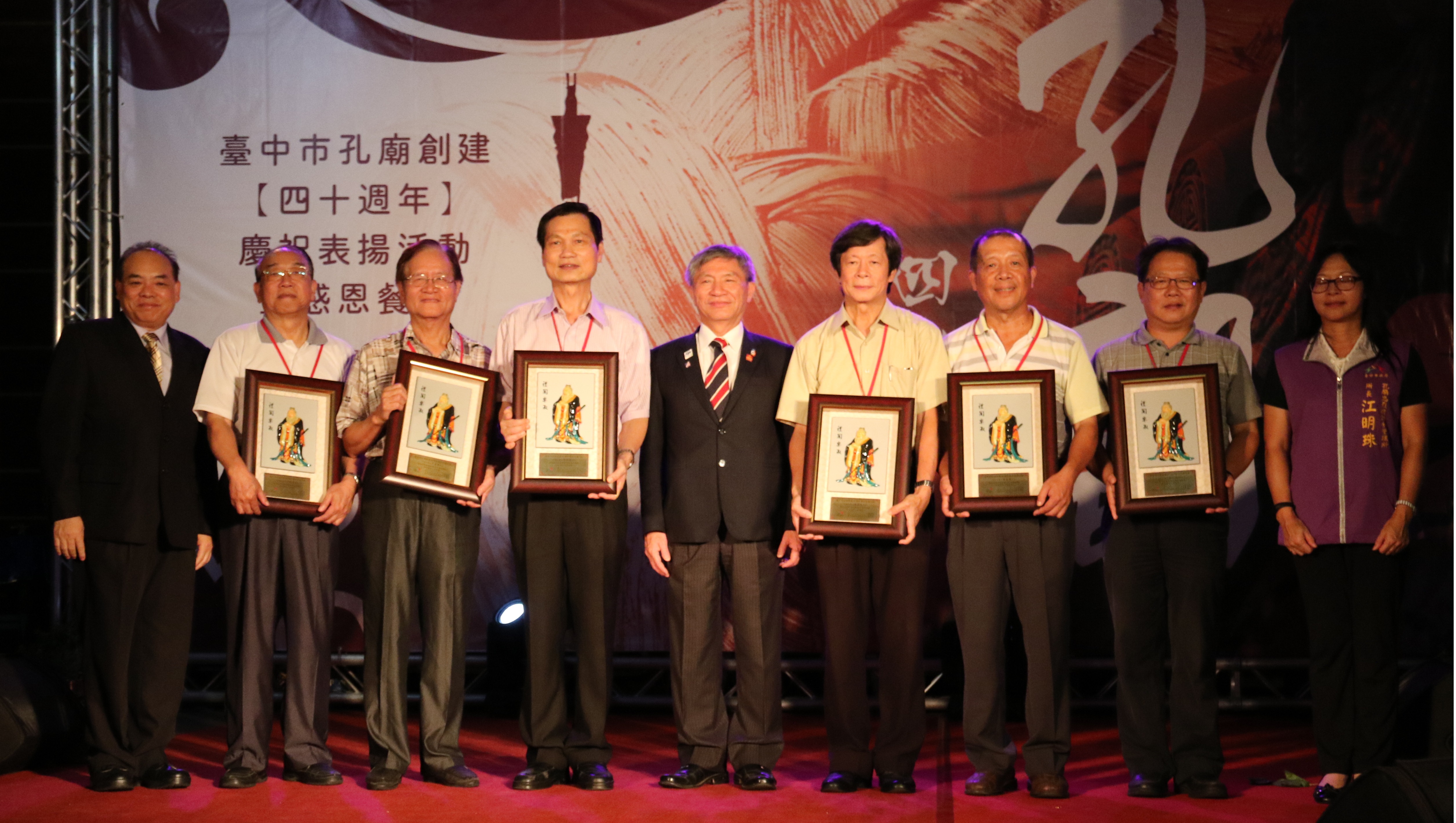 隨後張副市長也表揚執事人員司禮組曾清和、禮生馬延鵬、司詠組組長林俊彥校長、司佾組台中市東區力行國民小學、台中市合唱團、孔廟資深工作人員林珍瑜,以及由黃慶聲老師帶領的華光國樂團等人,感謝他們對孔廟的貢獻。