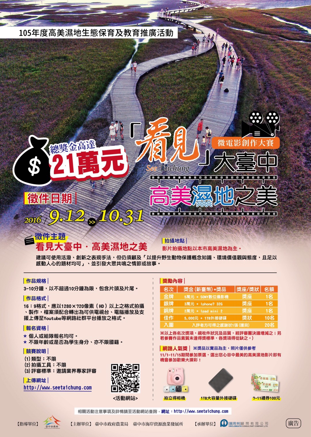 為提倡濕地生態保育,讓更多人認識高美濕地的美麗,海資所舉辦「看見大台中-高美濕地之美」系列活動,以高美濕地為主軸,推出導覽員培訓課程,名額100名,課程免費,上完課程後,還可領到市府頒發的合格證書;另推出免費現場導覽解說,名額2000名,參加民眾有1份專屬限量悠遊卡封套可拿;還有微電影比賽,總獎金與獎品價值高達21萬元。