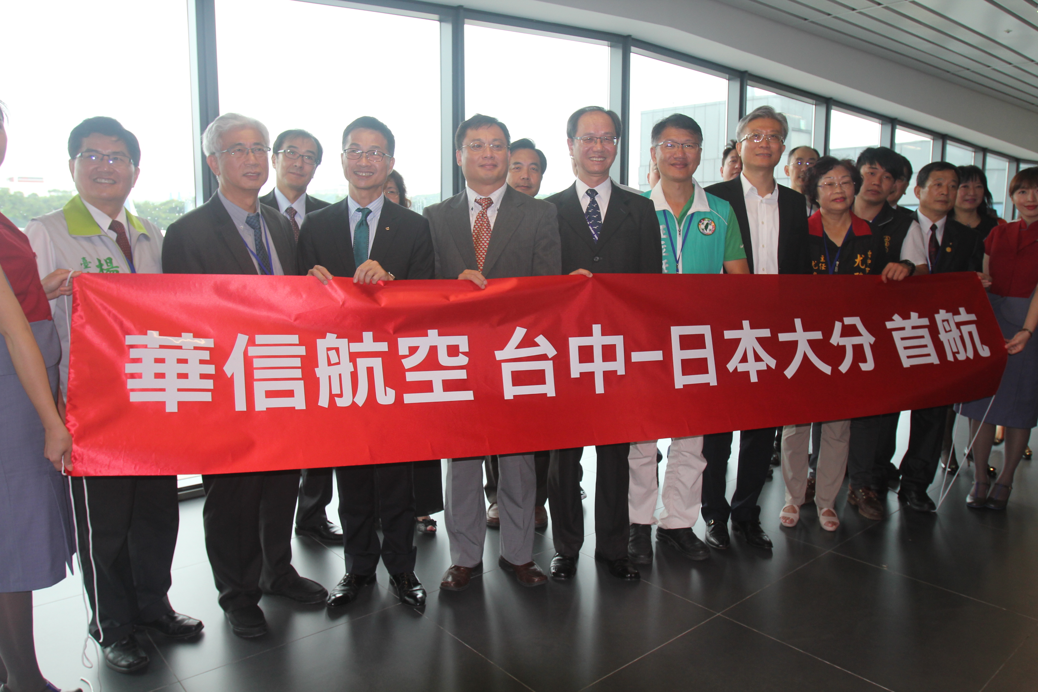 台中市政府與華信航空共同開闢台中-日本大分定期航班,每周四、日共飛航兩班次,今(15)日一早於台中清泉崗國際機場進行首航儀式,市府副秘書長郭坤明也與158名遊客,一起搭乘「花現台中」彩繪機飛往有「日本第一溫泉縣」美稱的大分縣,並盼兩地藉此展開全面性的交流。