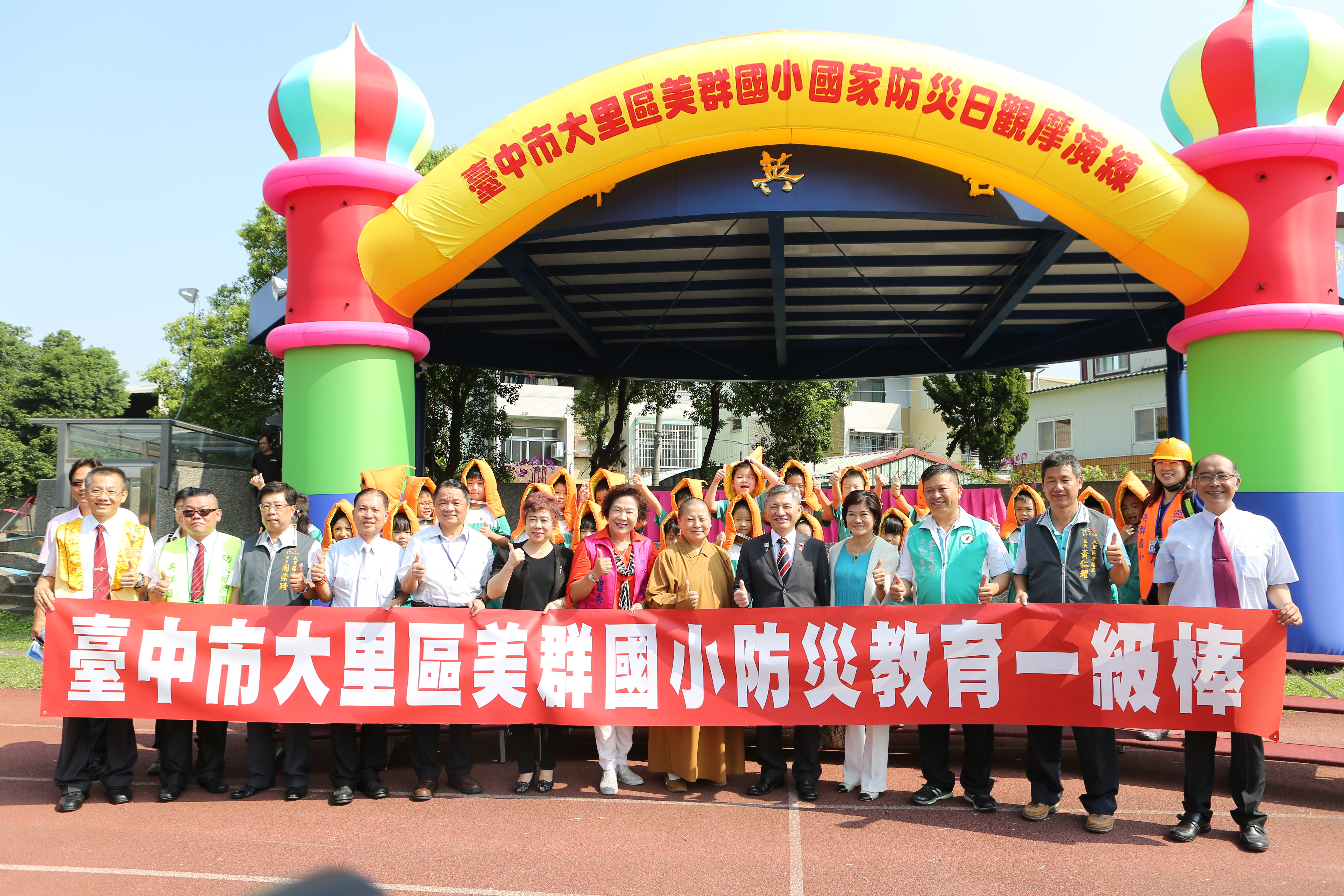 美群國小愛心工作隊也演出地震避難掩護及著火自救戲劇,讓學生從中學習面對災害發生時自救能力。市議員李天生、林碧秀、蘇柏興服務處代表等人也到場關心。