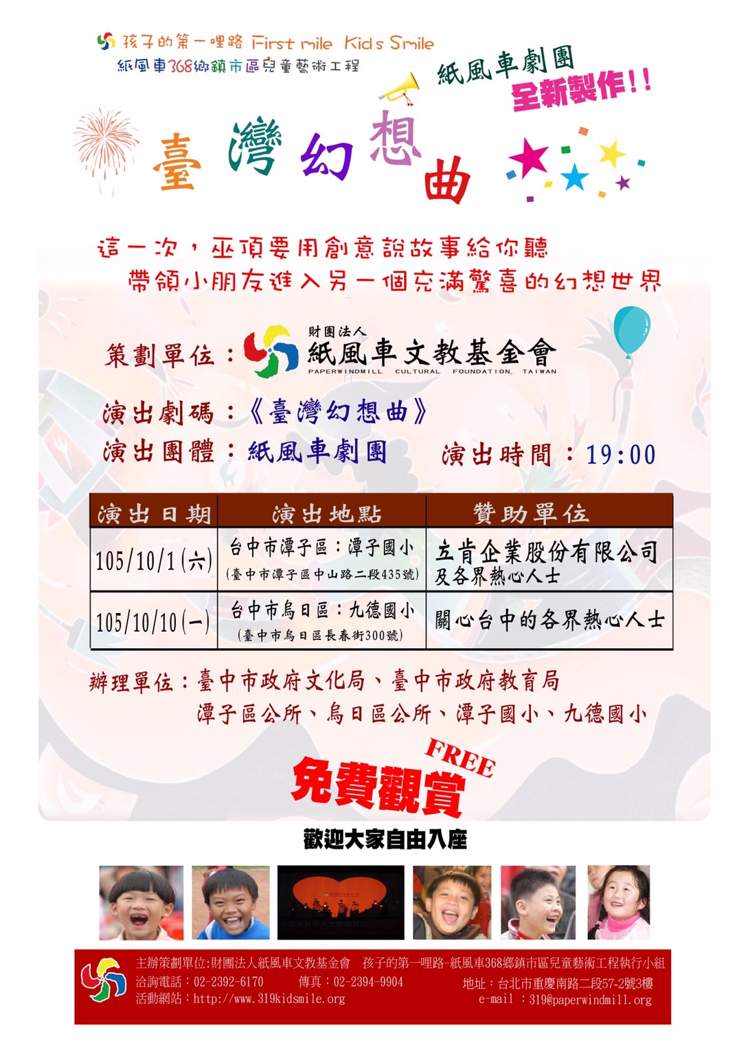 10月1日潭子國小場次,由立肯企業股份有限公司及台中各界熱心人士捐款演出,10月10日則由關心台中的各界人士捐款演出;民眾可免費入場欣賞,兩場預估總計服務3000位觀眾。詳細演出資訊可洽紙風車文教基金會網站查詢 http://www.319kidsmile.org/368/charm_368.asp 或電洽02 2392-6170。(9/23*17)*文化局