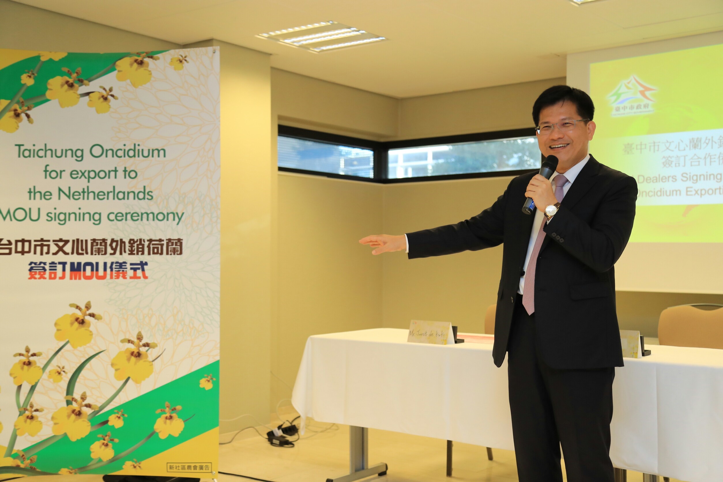 林市長表示,台中將於2018年舉辦世界花卉博覽會,這座花園城市以花卉產業聞名,尤其文心蘭品質絕佳;而荷蘭阿密爾市也將於2022年舉辦世界園藝博覽會,此次簽署合作備忘錄將是台灣文心蘭首次外銷花卉至荷蘭,是重要的里程碑,可說是花博最好的代言人,讓台灣站上歐洲舞台,由此開始展開文化等多面向交流。