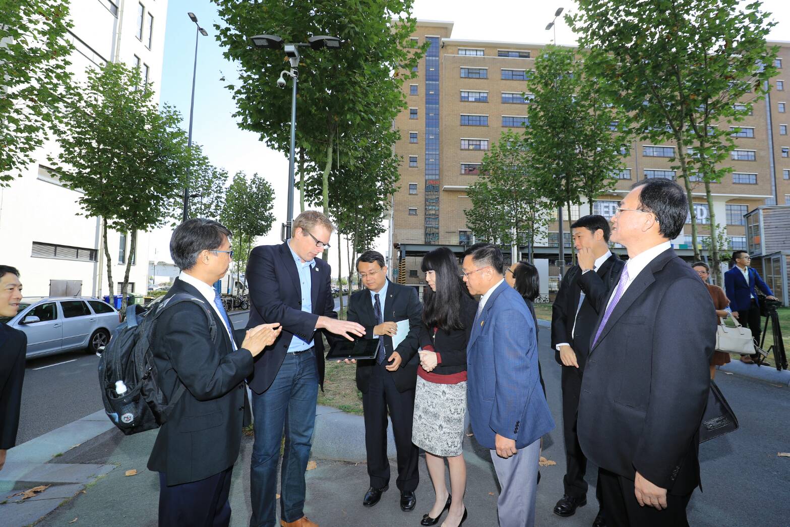 台中市長林佳龍原訂9月22日至29日出訪荷蘭、德國進行市政考察及招商引資,因颱風襲台已提前返國坐鎮,市府經濟發展局長呂曜志、秘書處長李如芳等人率領台灣企業代表今(26)日依照原訂行程參訪荷蘭恩荷芬市Strijp-S文創園區,由Strijp-S文創園區主任Thijs van Dieren導覽接待。