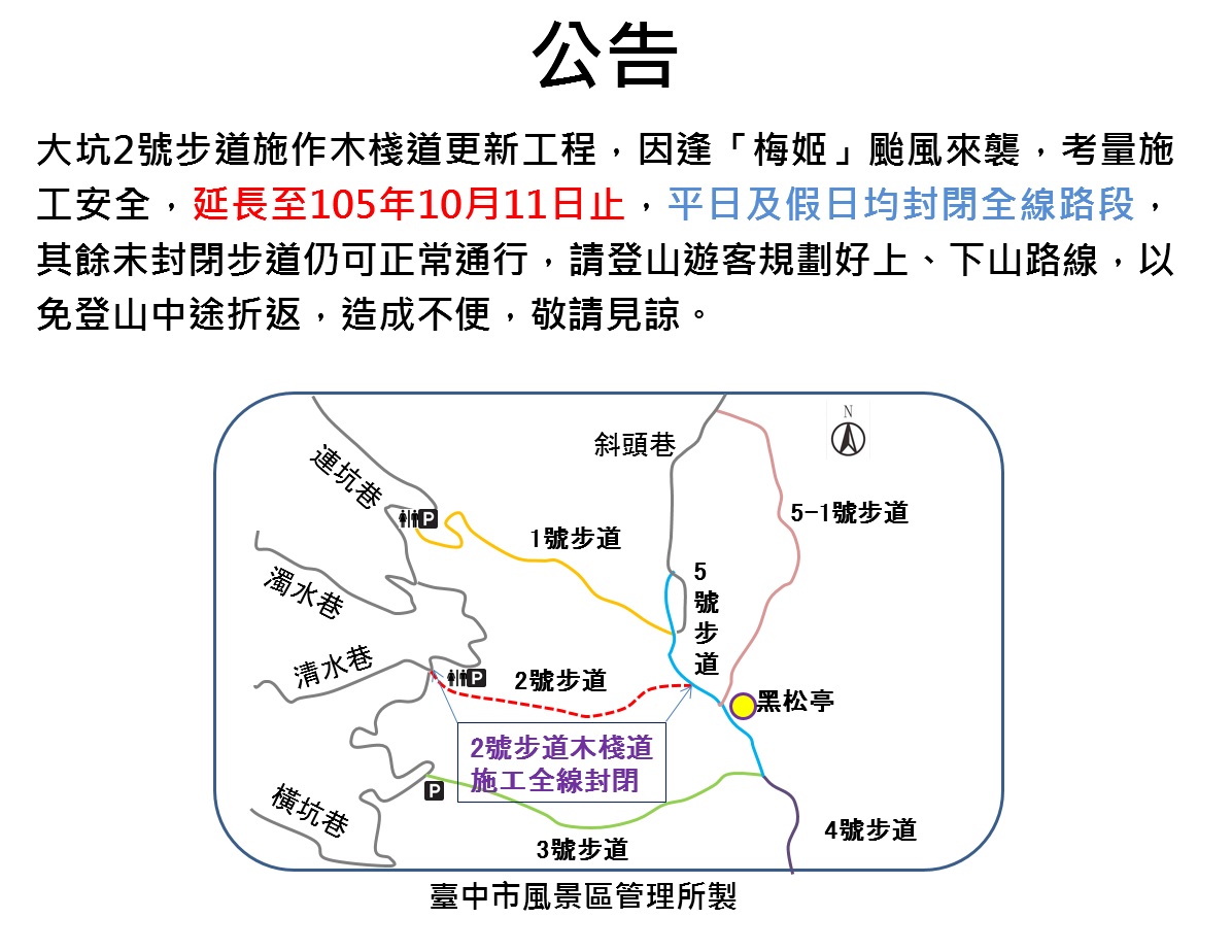 另外,大坑2號步道里程625公里至693公里處,共68公尺進行老舊木棧道汰換工程,目前已完成約40餘公尺,原預計於9月28日完成,因適逢颱風來襲,施工危險性大,施工期限延長至105年10月11日止,屆時將持續封閉2號步道全線路段,市府於步道出入口處皆設警示圍欄及張貼公告,呼籲民眾勿強行通過,以免發生危險。(9/29*8)*觀光旅遊局