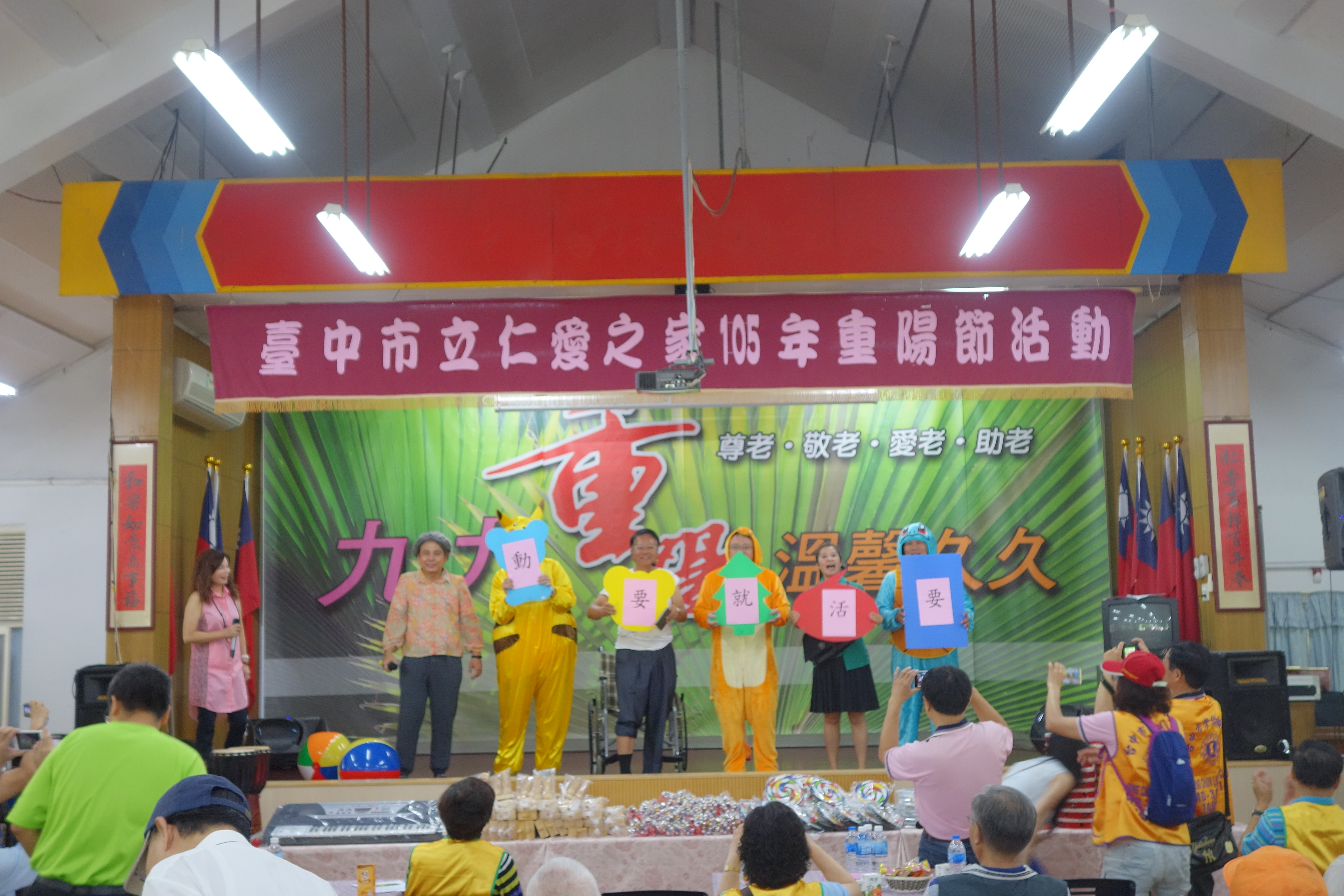 今年台中市立仁愛之家重陽敬老活動與台中市崇倫獅子會、台灣土地銀行中區各分行、台中市全人家長會長協會等單位聯合舉辦,活動中除了有仁愛之家動齡樂團演出、育仟幼兒園帶動唱、台中女中學生熱舞表演、朝陽科技大學吉他社演奏、歌手蔡義德演唱等精彩節目外,中國醫藥大學藥妝系同學更運用他們所學專業,為長輩們進行彩妝及芳香按摩等服務,會場中也安排義剪及按摩服務,此外,現場也準備平安餐跟長輩們共享;市議員曾朝榮也到現場與長輩同樂。