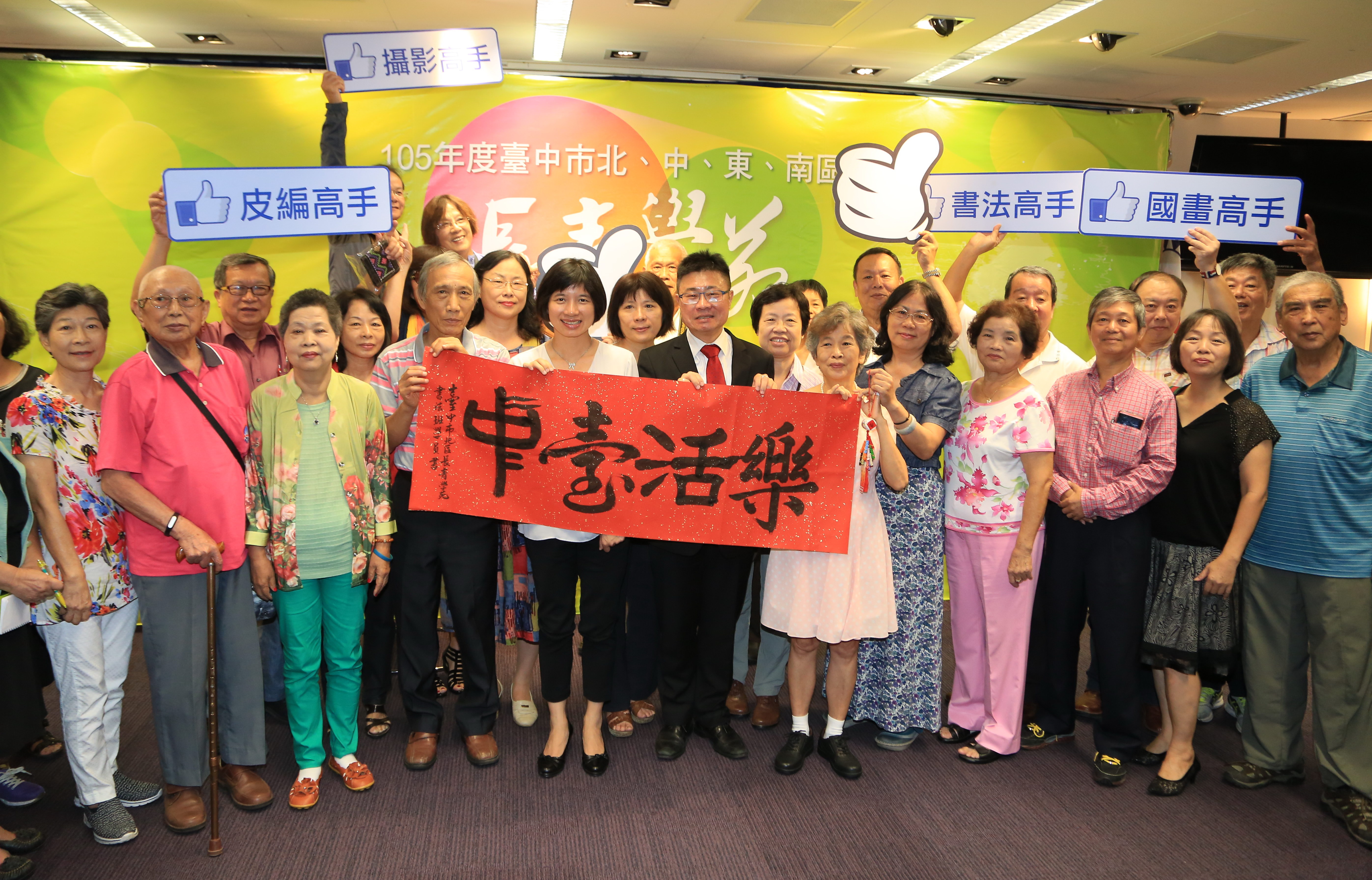 社會局今(4)日在台灣大道市政大樓舉辦長青學苑成果展開幕典禮,邀請長青學苑學員現場揮毫,寫出「樂活臺中」四個大字,字體優美,充分展現學習成果。副市長林依瑩、社會局長呂建德等人均出席共襄盛舉。