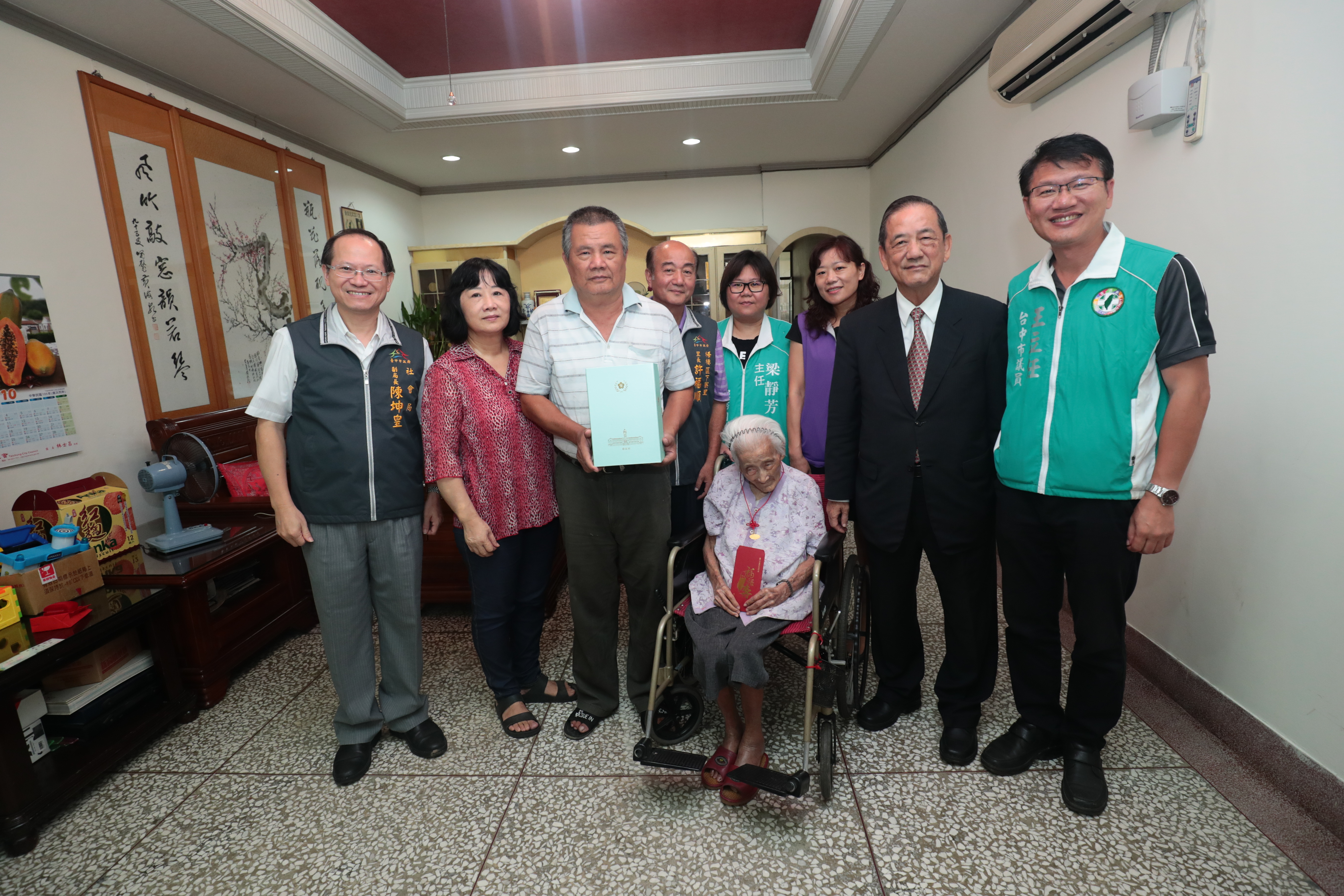 林副市長接著前往探視今年102歲的蔡隆慶阿公,蔡阿公從小務農,13歲開始肩負家計重擔,育有七名子女。目前與次子同住,三代同堂,子孫承歡膝下。平常喜歡看電視、吃甜食,假日家人也會帶阿公出門走走。聽見林副市長要來致贈重陽禮金,阿公靦腆說「歹勢啦!」可愛模樣讓身旁子女也笑得開心。