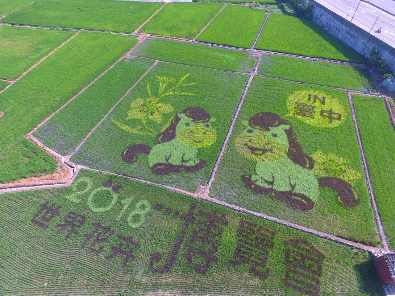 農業局表示,彩繪稻田位置在大甲區北提西路與經國路交叉口旁的農田,以花博特色動物「馬」及台中特色花卉「百合」為主題,並將「2018世界花卉博覽會」字樣彩繪於稻田中,運用白、綠、黃、紫等顏色稻秧編織成彩繪圖騰,這次彩繪稻田設置工作自今年7月間開始,歷經整地、劃線、設立座標、對圖、插秧、田間管理等過程,現在終於成形。