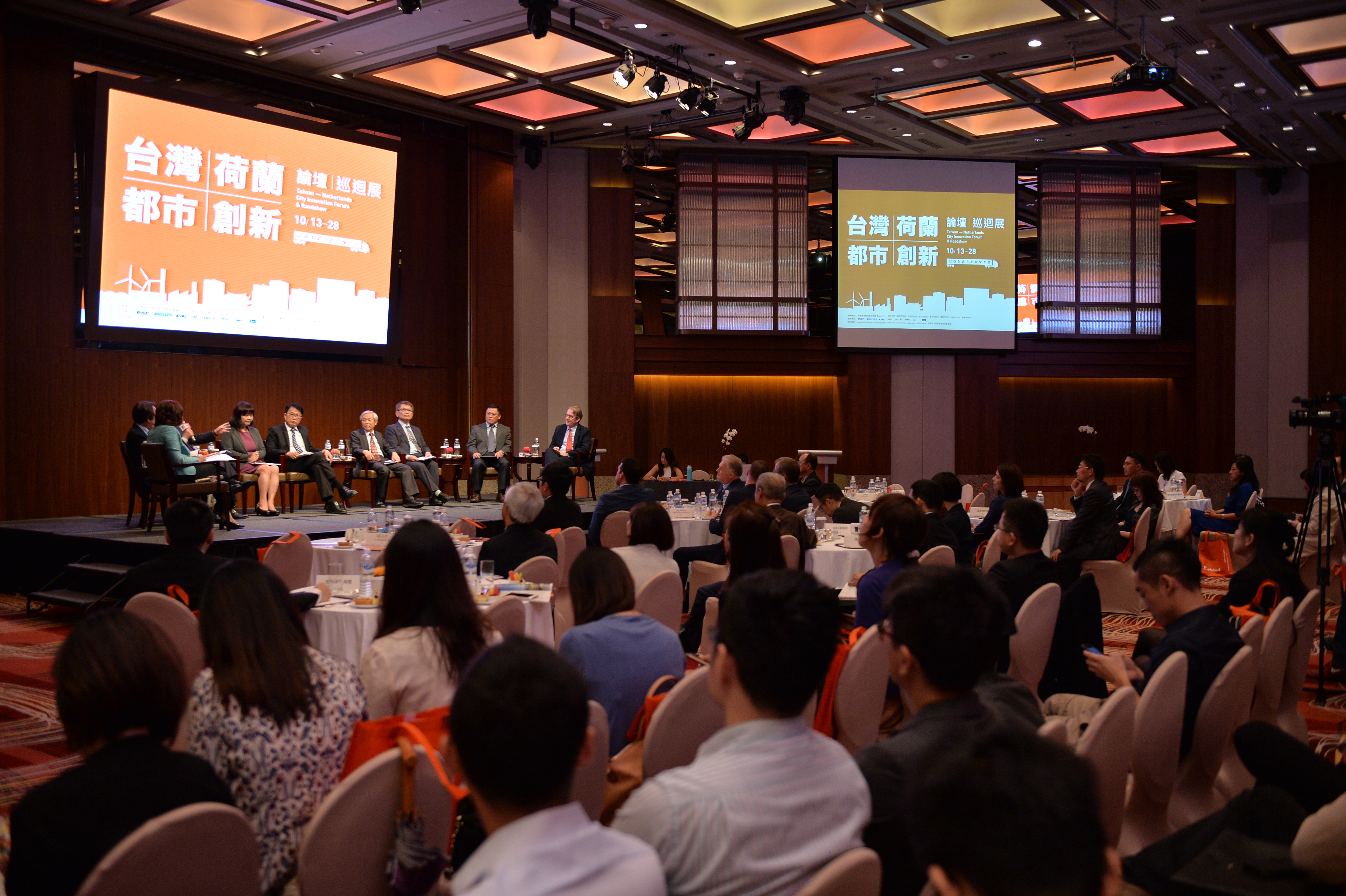 今天都市高峰會談,由荷蘭貿易暨投資辦事處代表紀維德與台北市副市長林欽榮、桃園市副市長王明德,新竹市副市長沈慧虹、台南市副市長顏純左、台東縣副縣長陳金虎、台中市副秘書長郭坤明、高雄市研考會主委劉進興等7位縣市政府首長進行都市創新對談,荷蘭外交部對外貿易次長Marten van den Berg也出席活動。