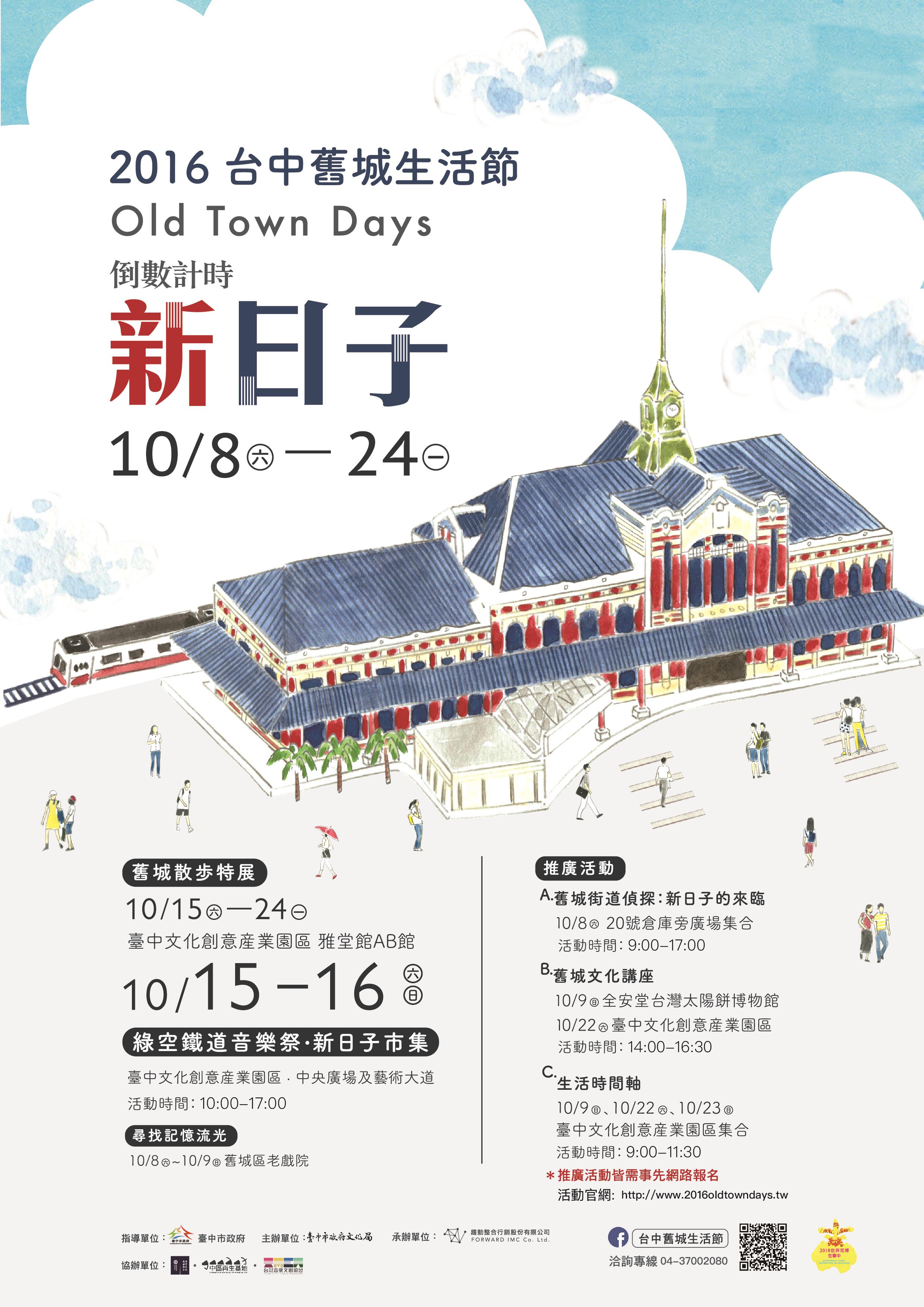 以「倒數計時,新日子」為主題的「2016台中舊城生活節」主活動「綠空鐵道音樂祭」、「新日子市集」將於週末2天(15日及16日)在台中文創園區登場,「綠空鐵道音樂祭」是由中生代樂團「農村武裝青年」、《TIME》雜誌報導2012美國南方音樂節(SXSW)最佳樂團之一的「銀巴士」、新生代創作歌手柯泯薰、魏嘉瑩等12組樂團接力演出;而以〈向前走〉一曲重寫台語歌曲文化的林強,和電音團體「志樂制樂」也將聯手帶來2小時的壓軸表演!活動詳細資訊可上2016台中舊城生活節官方網站http://www.2016oldtowndays.tw/  或台中市政府文化局網站http://www.culture.taichung.gov.tw/  查詢。