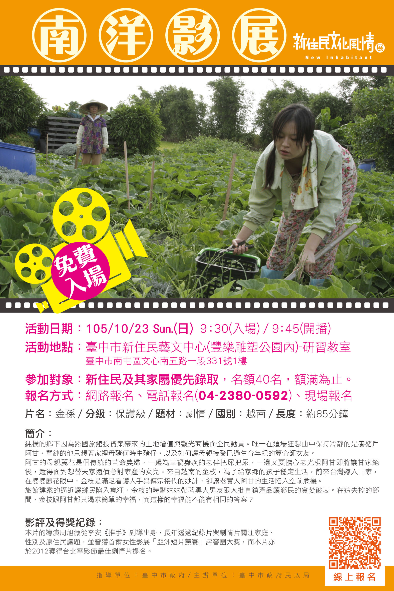 民政局於10月23日(日)上午9時30分在台中市新住民藝文中心(南屯區豐樂雕塑公園綜合活動中心)研習教室,舉辦「105年台中市新住民影展活動」,安排放映2012年獲得台北電影節最佳劇情片提名電影「金孫」,歡迎新住民朋友踴躍報名參加!http://bit.ly/2dg0Xib