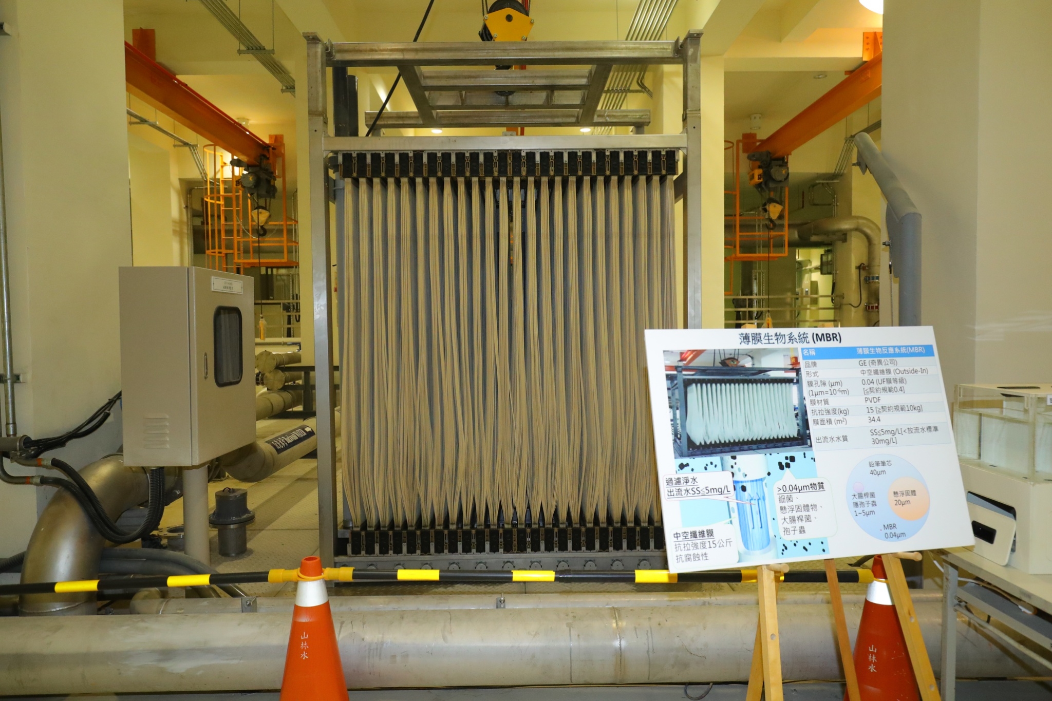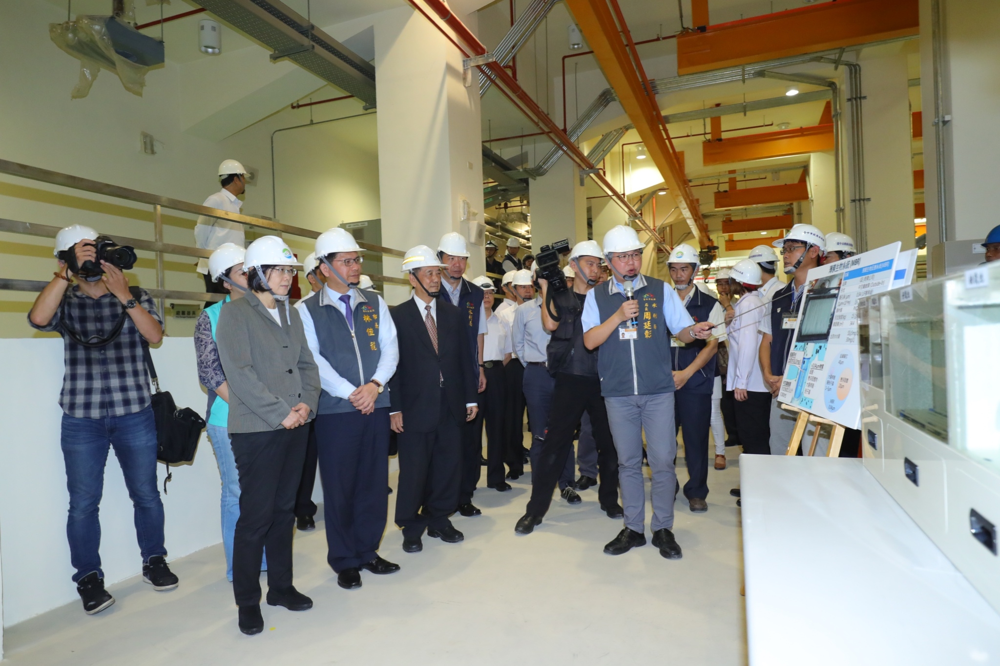 總統蔡英文今(16)早參加台中鐵路高架化啟用典禮後,隨即在台中市長林佳龍陪同下,前往視察台中「水湳水資源回收中心」及全國首座社區型「中水道管網系統」,現場由水利局長周廷彰進行簡報,說明中水道系統處理設施、過程及功效,接著蔡總統一行人也進入膜濾池區,視察膜組展示。