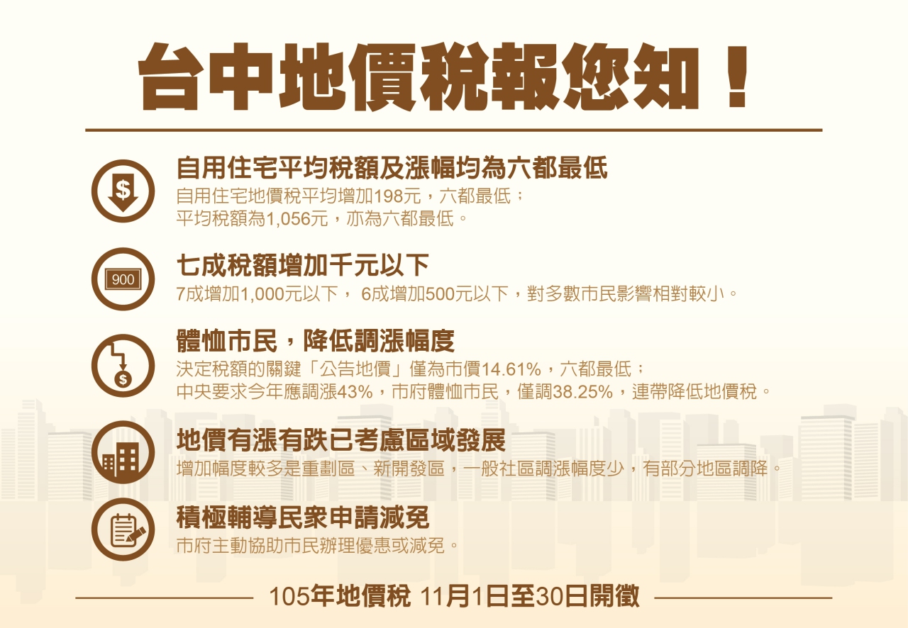 他也說,本次公告地價調整,已考慮各區域發展。因此,地價稅增加幅度較明顯部分為重劃區,或近年蓬勃發展的新開發地區,一般地區的增加幅度較少。為保障市民權益及避免爭議,市府藉由各種管道,積極主動輔導納稅義務人申請按自用住宅及工業用地優惠稅率課徵或減免地價稅。