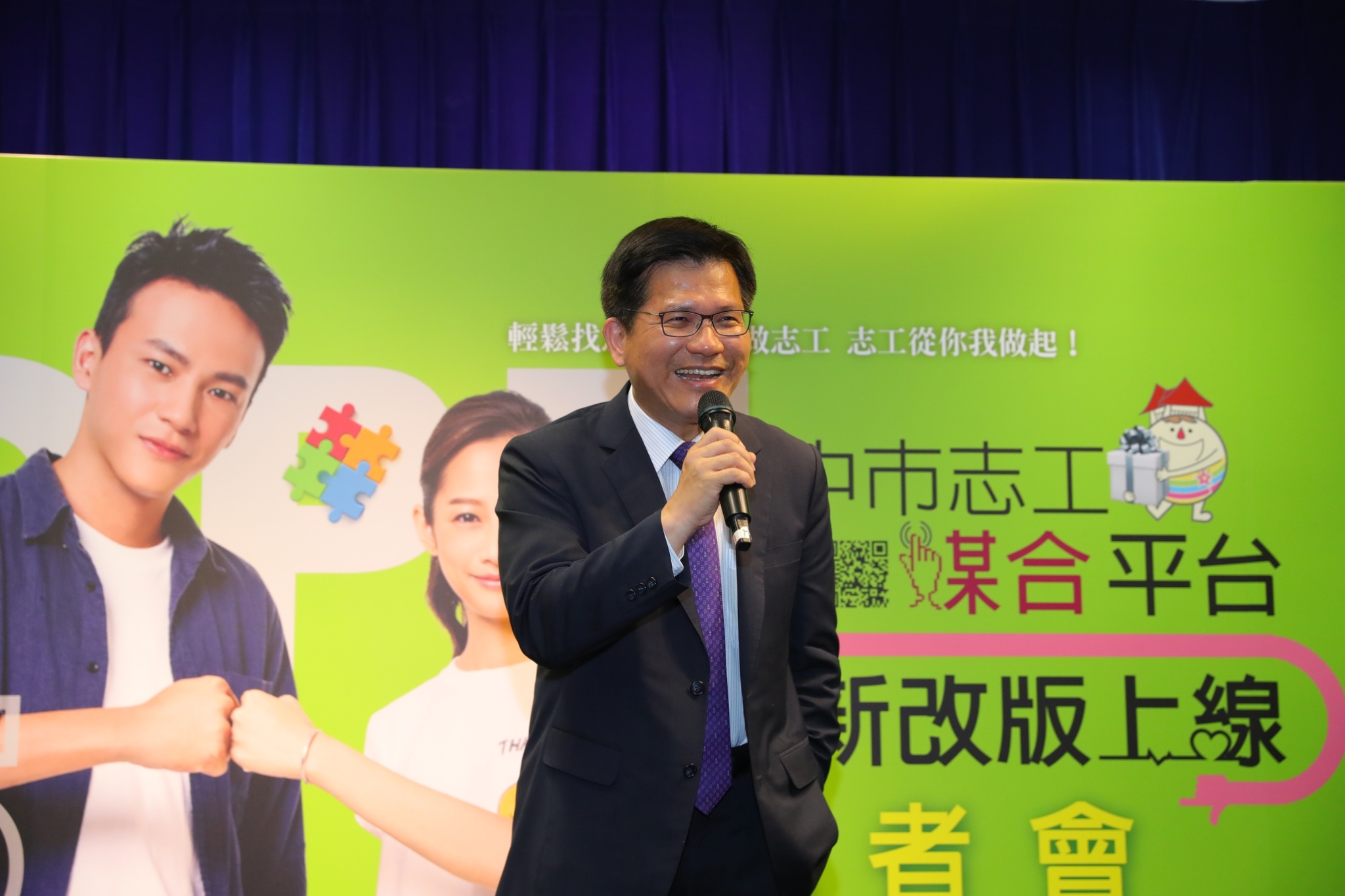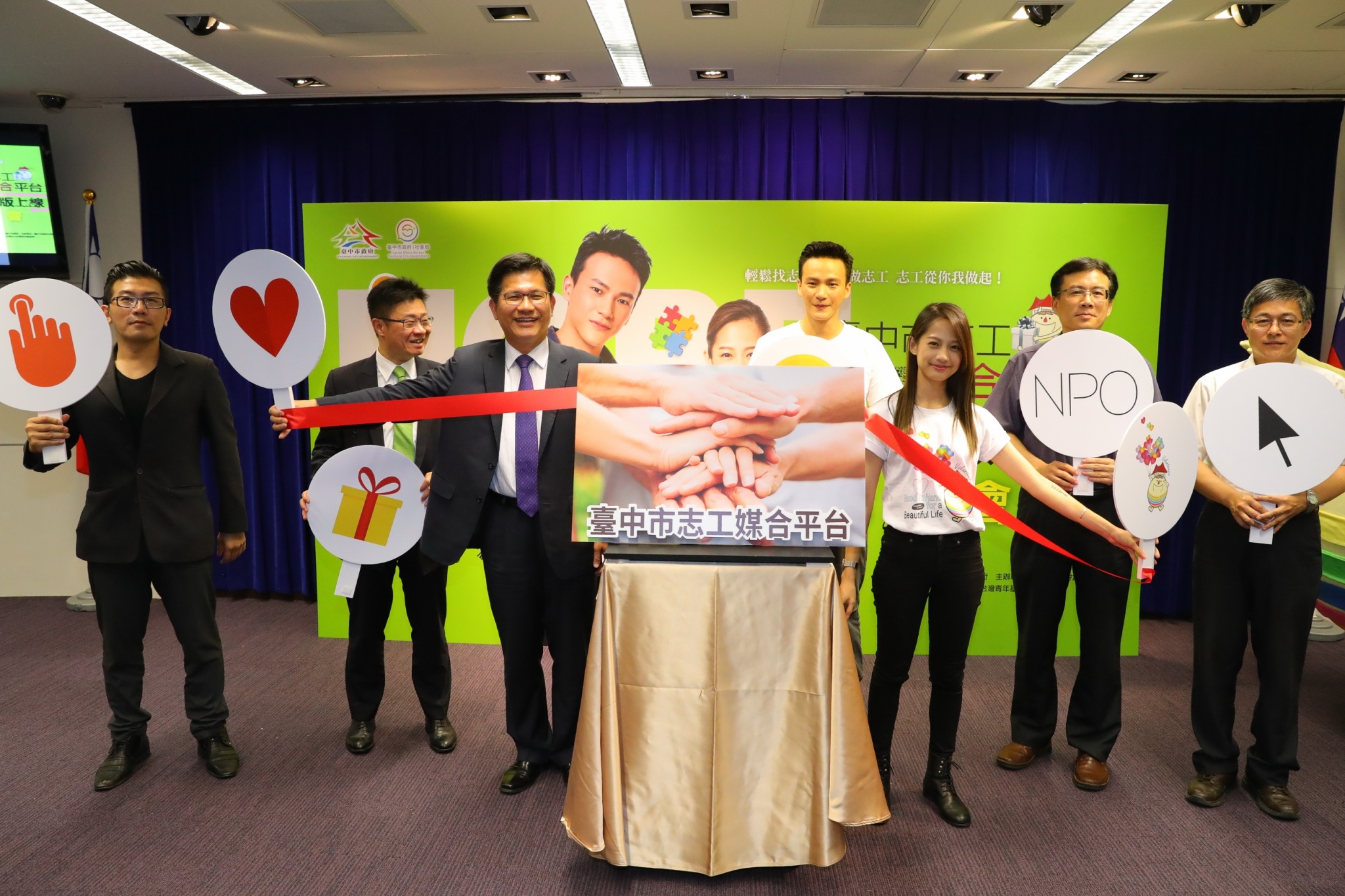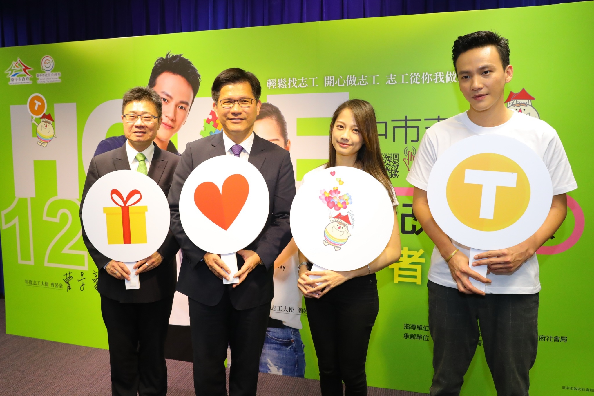 市府社會局推出全新改版的志工媒合平台,今(21)日在台灣大道市政大樓舉辦啟動儀式,林市長在社會局長呂建德的陪同下出席,年度台中志工大使藝人簡嫚書及曹晏豪均到場代言,拓凱實業股份有限公司專案經理白世杰也到場見證,現場氣氛熱鬧溫馨。