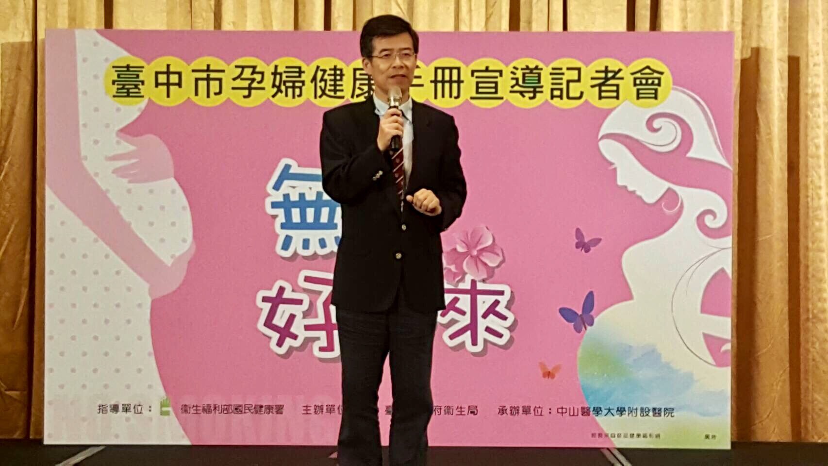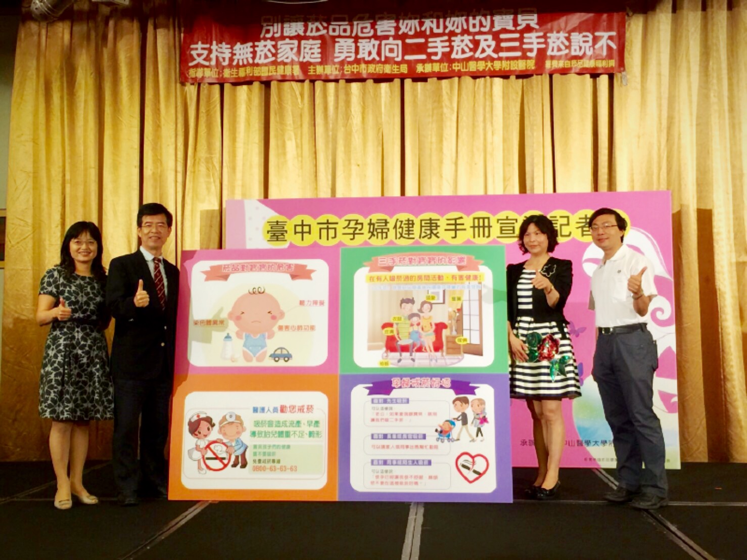 市府衛生局今(22)日在金典酒店舉辦「無菸好孕來」孕婦健康手冊宣導記者會,衛生局長徐永年、中山醫學大學附設醫院副院長李秋香等人,共同手持孕婦健康手冊的意象造型,並由徐局長親自翻閱,象徵正式推動「無菸好孕來孕婦健康手冊」。