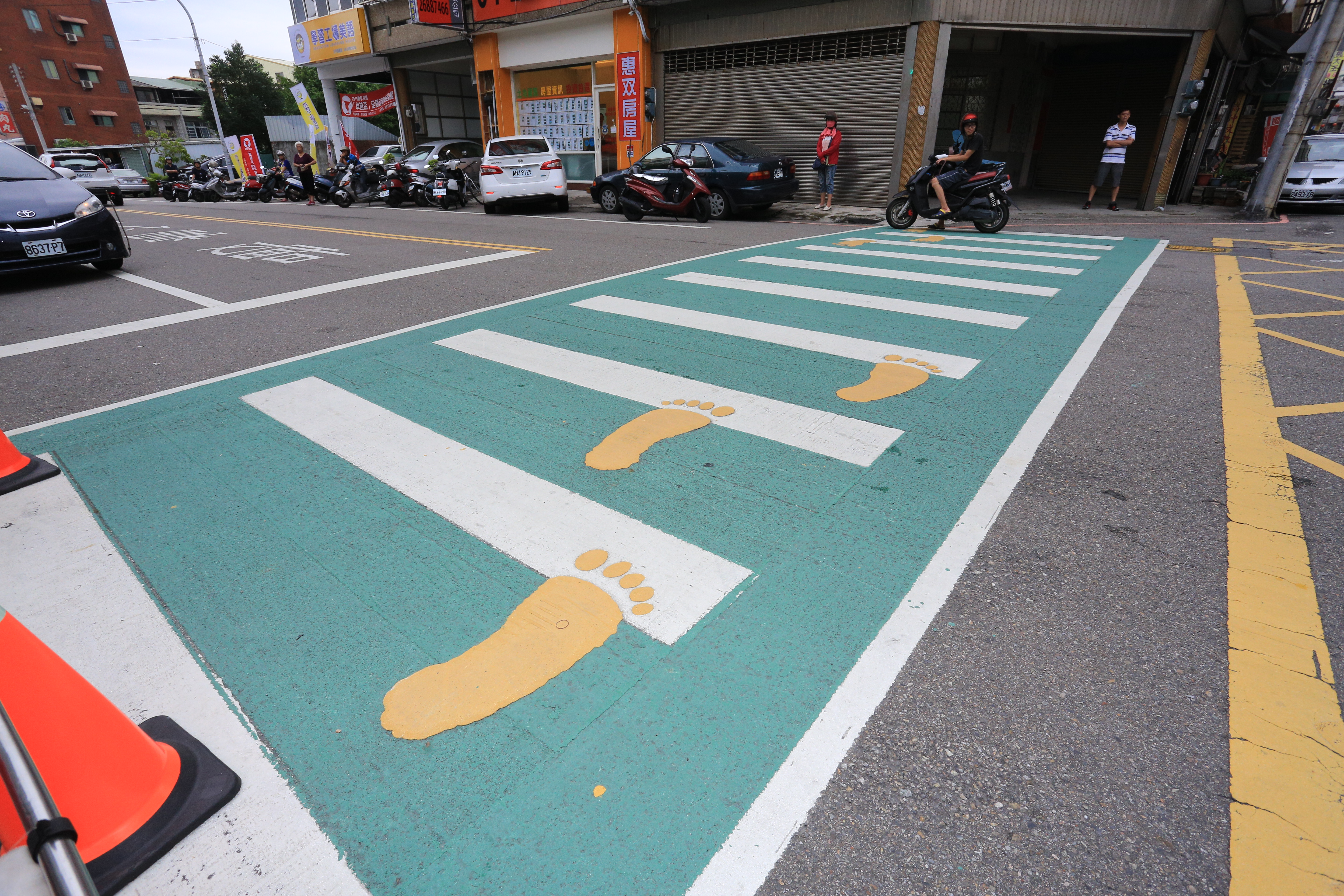 交通局長王義川表示,綠斑馬具有色彩鮮明、防滑及施工簡便等3項特色,以代表環保及以人為本的綠色為基底鋪設,強調行人路權,明確區分行走範圍;標線的路面防滑係數在BPN 65以上,較一般傳統標線抗滑係數BPN 45來的高,除了可降低機車騎士滑倒的風險外,也增進用路者的安全。