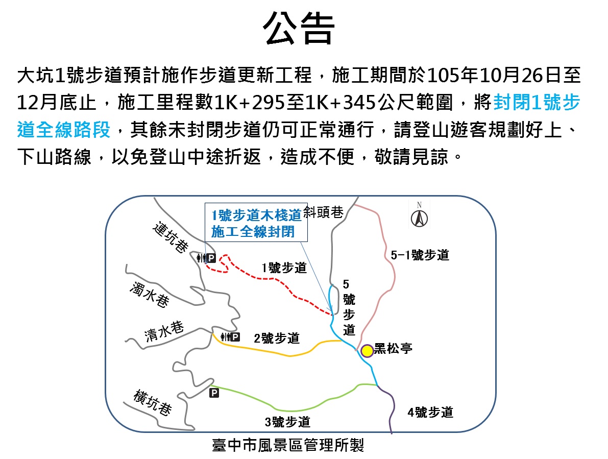 為避免民眾中途折返,施工期間封閉1號步道全線路段,其餘未封閉步道仍可正常通行,請登山遊客規劃其他上、下山路線。台中市風景區管理所強調,大坑1號步道於封閉期間,將於步道出入口處設警示圍欄及張貼公告,請民眾勿強行通過,以免發生危險。(10/26*17)*觀光旅遊局