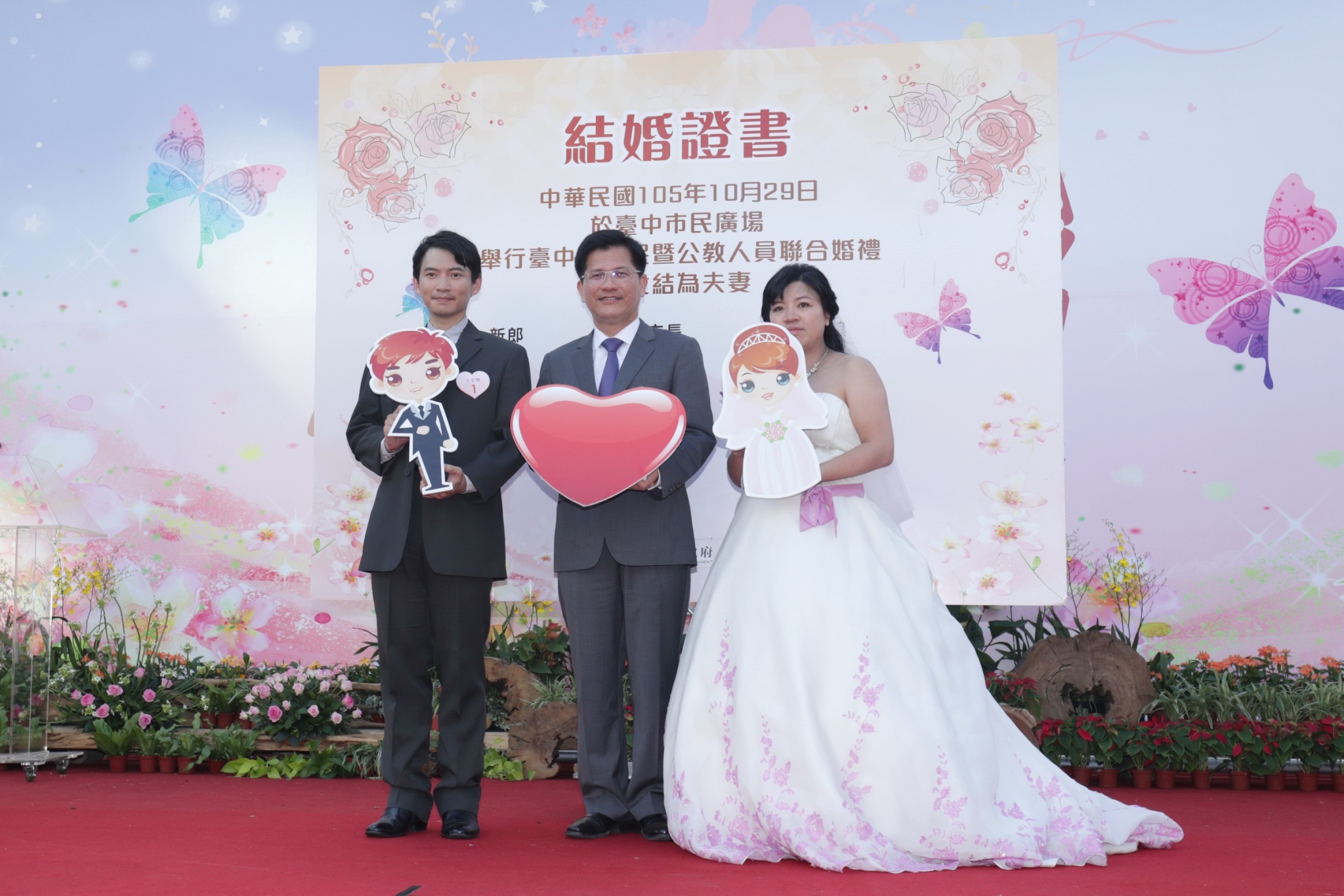 台中市政府民政局今(29)日在市民廣場舉行「2016花現珍愛」聯合婚禮,共有136對新人在觀禮貴賓、家人及朋友的幸福見證下,彼此承諾互相扶持、白頭到老,並浪漫擁吻136秒。市長林佳龍也到場祝福在場所有新人百年好合、永浴愛河。