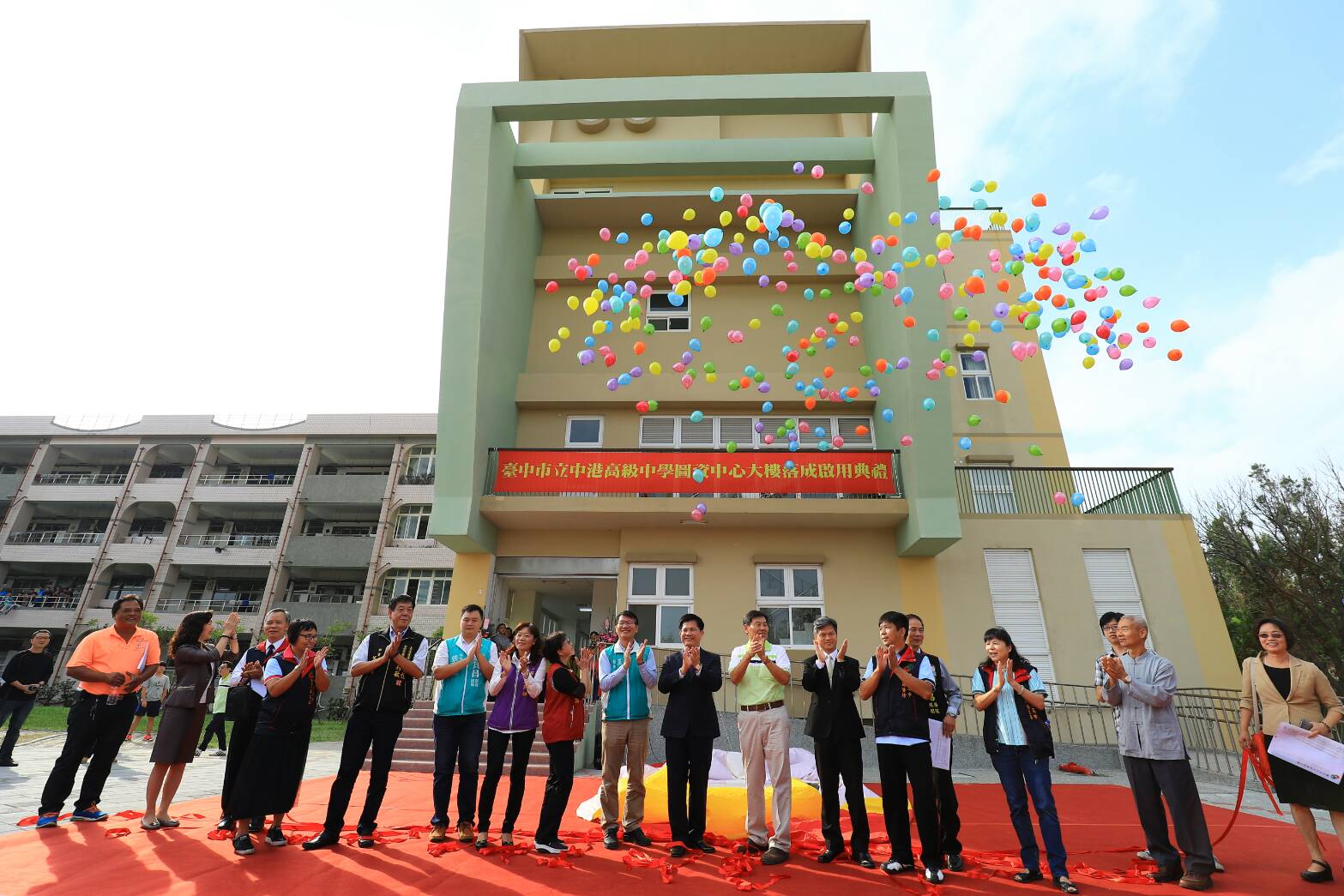 林市長表示,今天是台中市海線地區優質學校中港高中的校慶,也是圖資中心的落成啟用日,感謝地方議員及林士昌議長與張清照副議長等人支持;中港高中辦學成績良好,學子德智體群美等各方面發展均五育並進,今日圖資中心落成啟用,如同一艘知識方舟,讓孩子們透過圖資中心看見世界。
