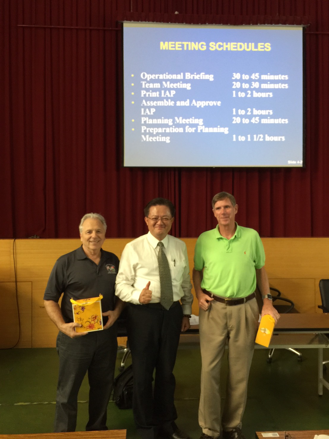 消防局自104年起即邀請美國消防學院教官來台授課,去年講授內容為火災搶救指揮系統(Command and Control of Incident Operation, CCIO) ,此系統是針對火災發生時的指揮、調度能力之訓練:今日則以「天災及人為災害」為主題,教授指揮官於災害現場指揮、協調及派遣的機制。