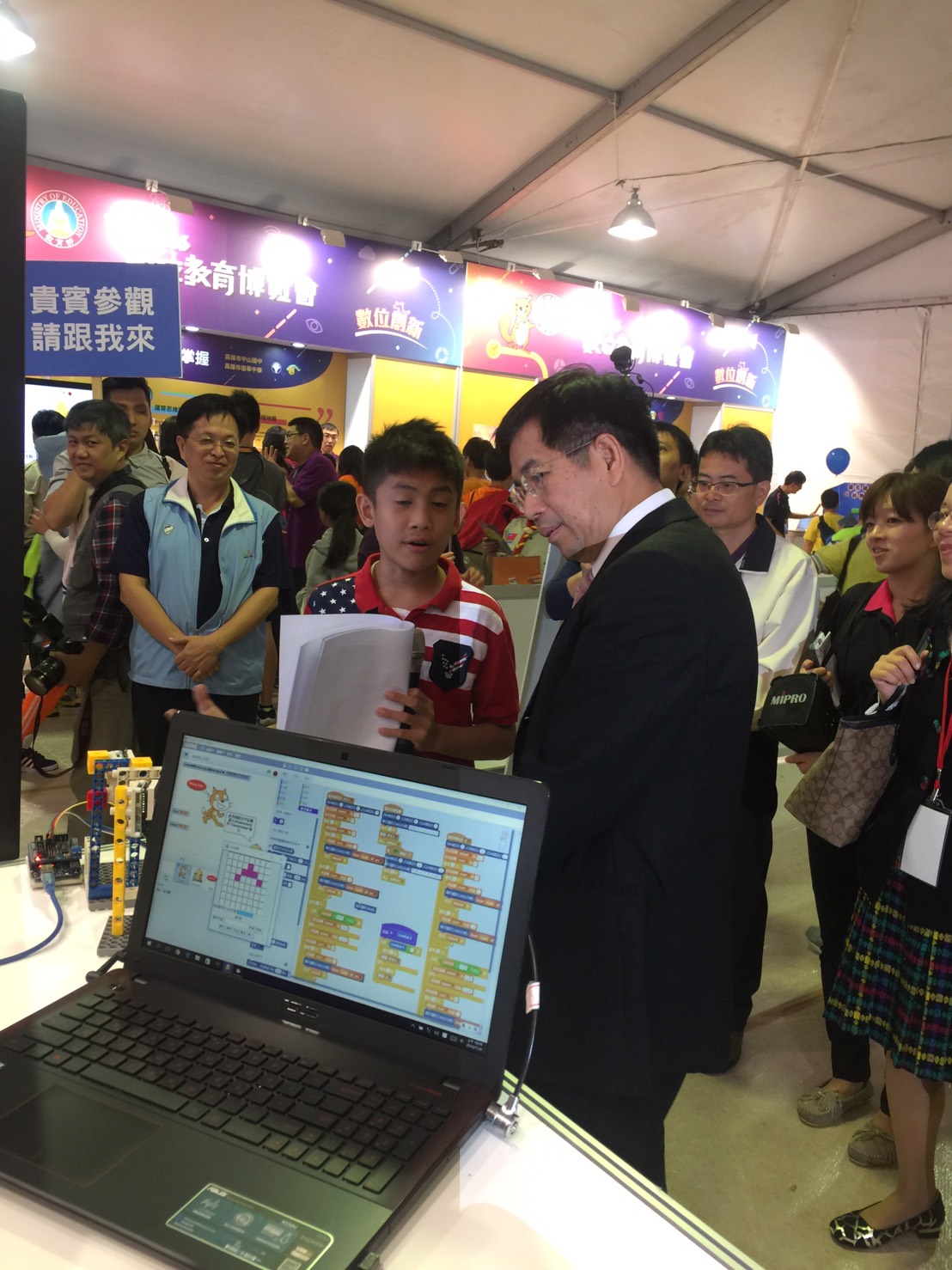 台中市教育局以「創客數位學習」為主題參展,首日參展民眾反應相當熱烈,教育部長潘文忠也親臨攤位參觀聽取學生講解運算思維設計的構思;市府教育局長彭富源表示,台中市積極推動數位適性整合學習,全面普及校園無線網路化,結合e化數位教室設備搭配教材資源庫,豐富遠距教學內容,建立不受時空限制的個人化學習環境,翻轉被動式學習,縮短城鄉差距。