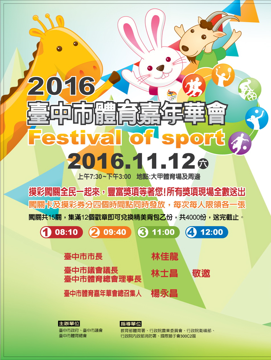 嘉年華會也設置15項闖關遊戲,只要集滿12個過關戳章後,即可兌換精美背包,限量4000份,換完為止;此外,大會還提供2台摩托車、6台液晶電視、40輛高級自行車、400份精美保鮮組,給現場民眾摸彩,獎品豐富,一同前來感受體育嘉年華會的熱鬧氣氛!本週還有不少展覽、演講等活動,更多活動資訊,請見「中市週末活動看板1112_1113」。(11/11*6)*新聞局