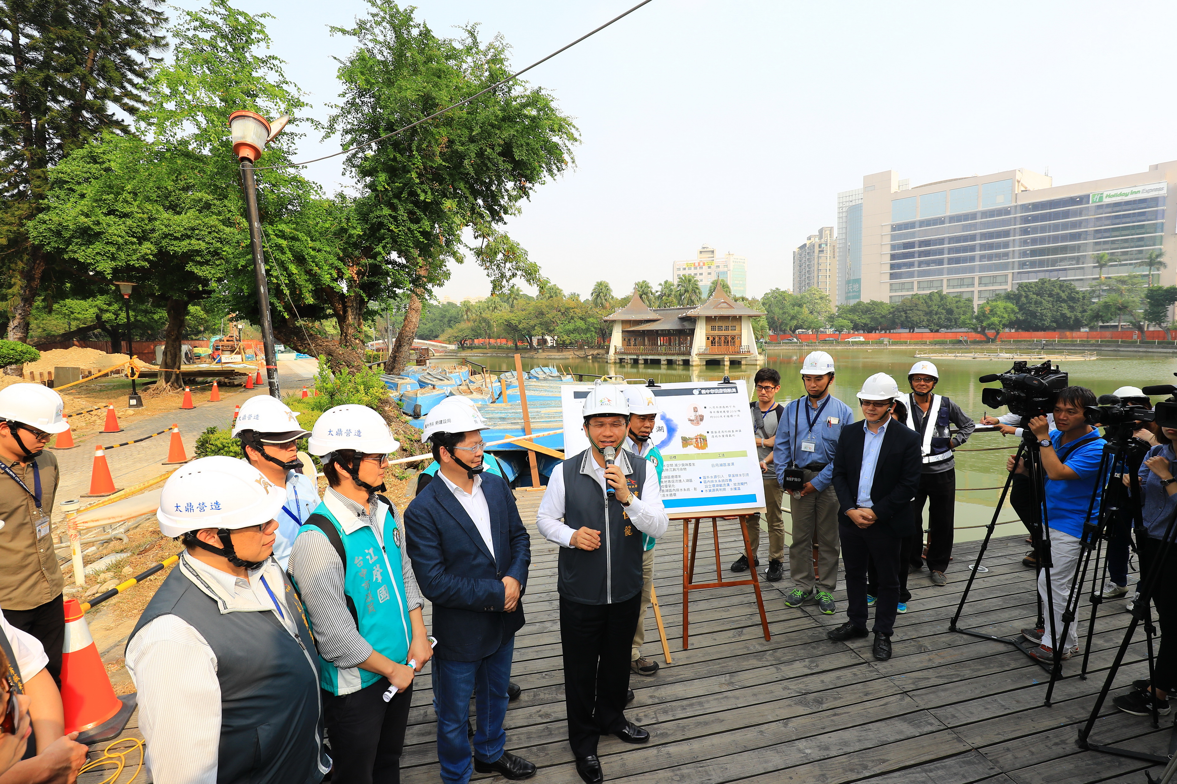 台中市政府今(14)日在台中公園舉辦「日月湖清淤工程」,與「綠空鐵道軸線計畫」工程會報,林市長聽取簡報後,在建設局長黃玉霖陪同下,逐一視察水撲滿、環湖截流溝攔污等工程施工現況。市議員何敏誠與江肇國均到場關心。