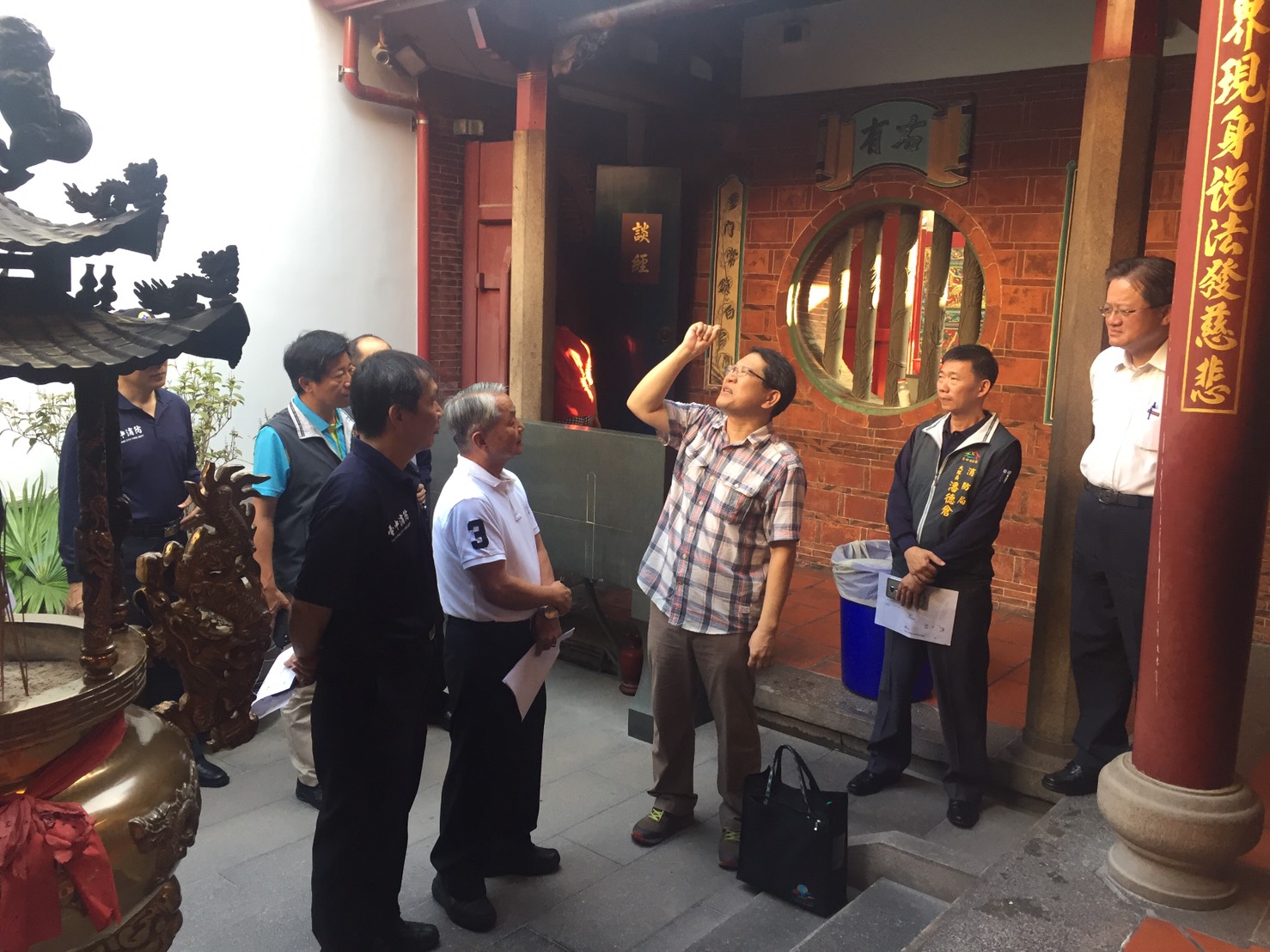 消防局並邀集文化局、萬和宮代表及南屯里里長等,進行該宮廟典藏古物及內外動線進行現勘,同時邀請對於古蹟防災與公共安全有深入研究之中央警察大學教授簡賢文與會,進行研討並協助評估,進一步提供相關防救災建議事項,相關會勘研討成果並將具體呈現於示範演練中。