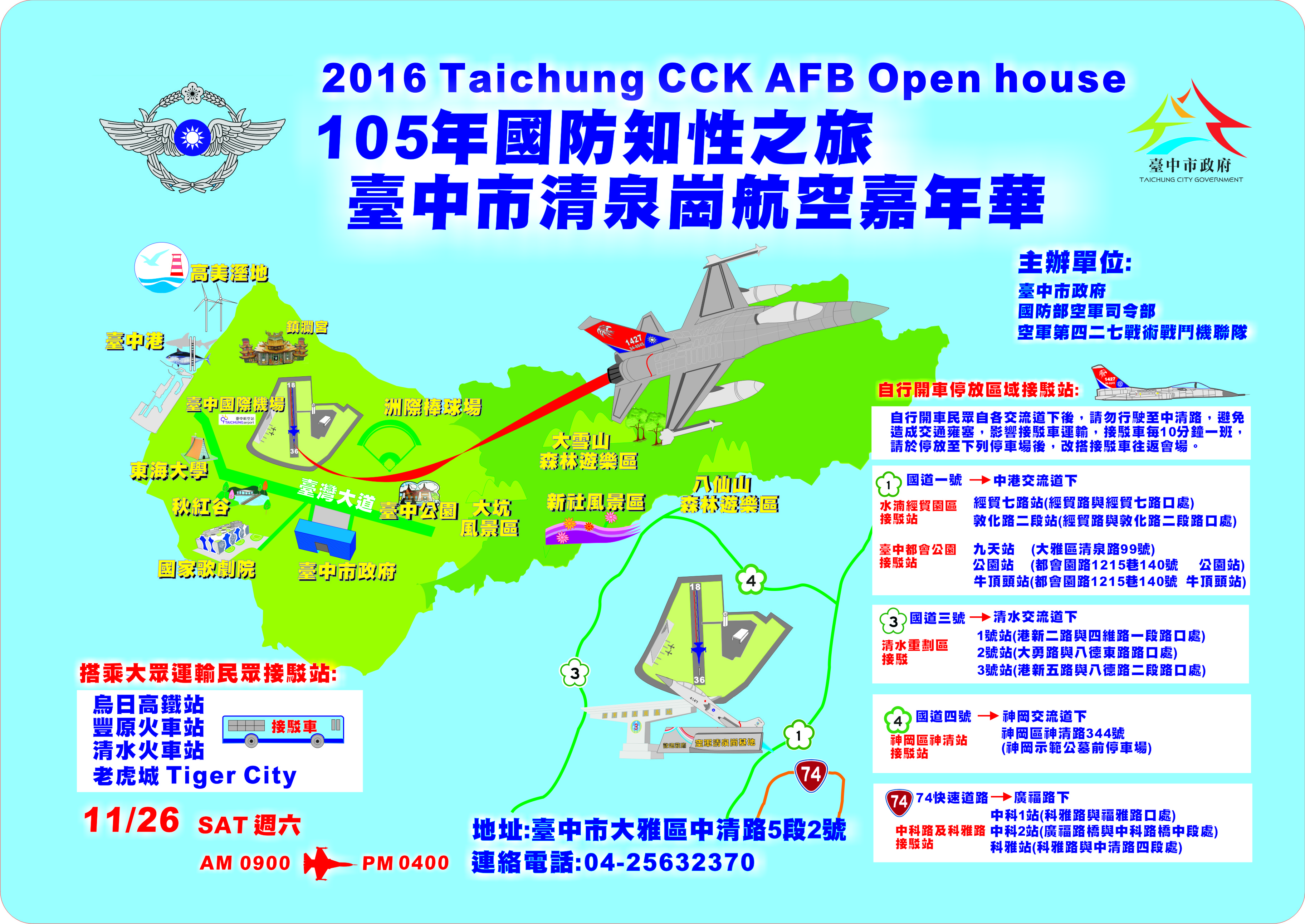 營區開放時間為當日上午9時至下午4時,為避免基地週邊交通壅塞,採專車接駁方式,不開放自小客車進出。各接駁站均於上午6時開始發車,接駁車將直接開至基地內營區開放會場,針對搭乘大眾運輸工具的民眾,可於高鐵台中站(烏日)、豐原火車站、清水火車站及老虎城(朝馬)等4處轉乘接駁車;自行開車部分,則規劃於水湳經貿園區、科雅及中科路、台中都會公園、清水重劃區、神岡示範公墓等5處設置接駁站。