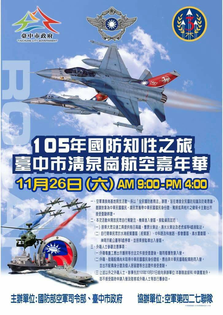 清泉崗航空嘉年華11月26日在清泉崗空軍基地登場,一連串空軍樂儀隊操演、各型主力戰機展示及雷虎小組飛行表演,展示空軍訓練成果;由於台中市獲中央支持發展「智慧機械之都」,台中市政府全力推動航太產業結合精密機械,配合清泉崗機場升級國際機場,將爭取2017國際航太暨國防工業展在清泉崗舉辦,希望為飛機零組件製造與維修產業發展引進更大動能。