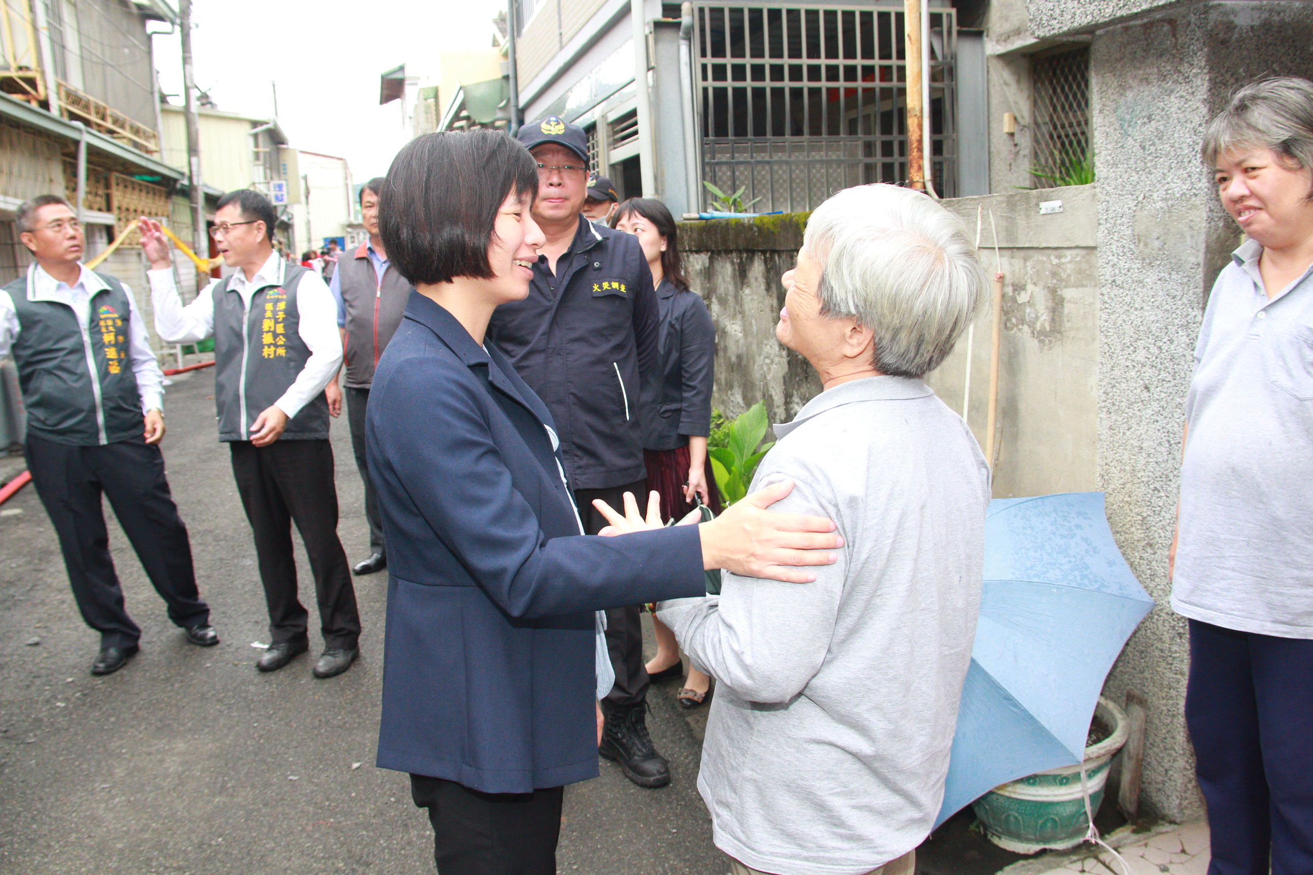 林副市長昨日在消防局長蕭煥章、社會局副局長陳坤皇、潭子區長劉振村等人陪同下,到火警現場探視災民,關心目前安頓現況。對於憾事感到十分不捨。許多災民對於市府的關心表示感謝,也有住戶當場提出建言,希望市府再加強老舊社區消防演練與設備。