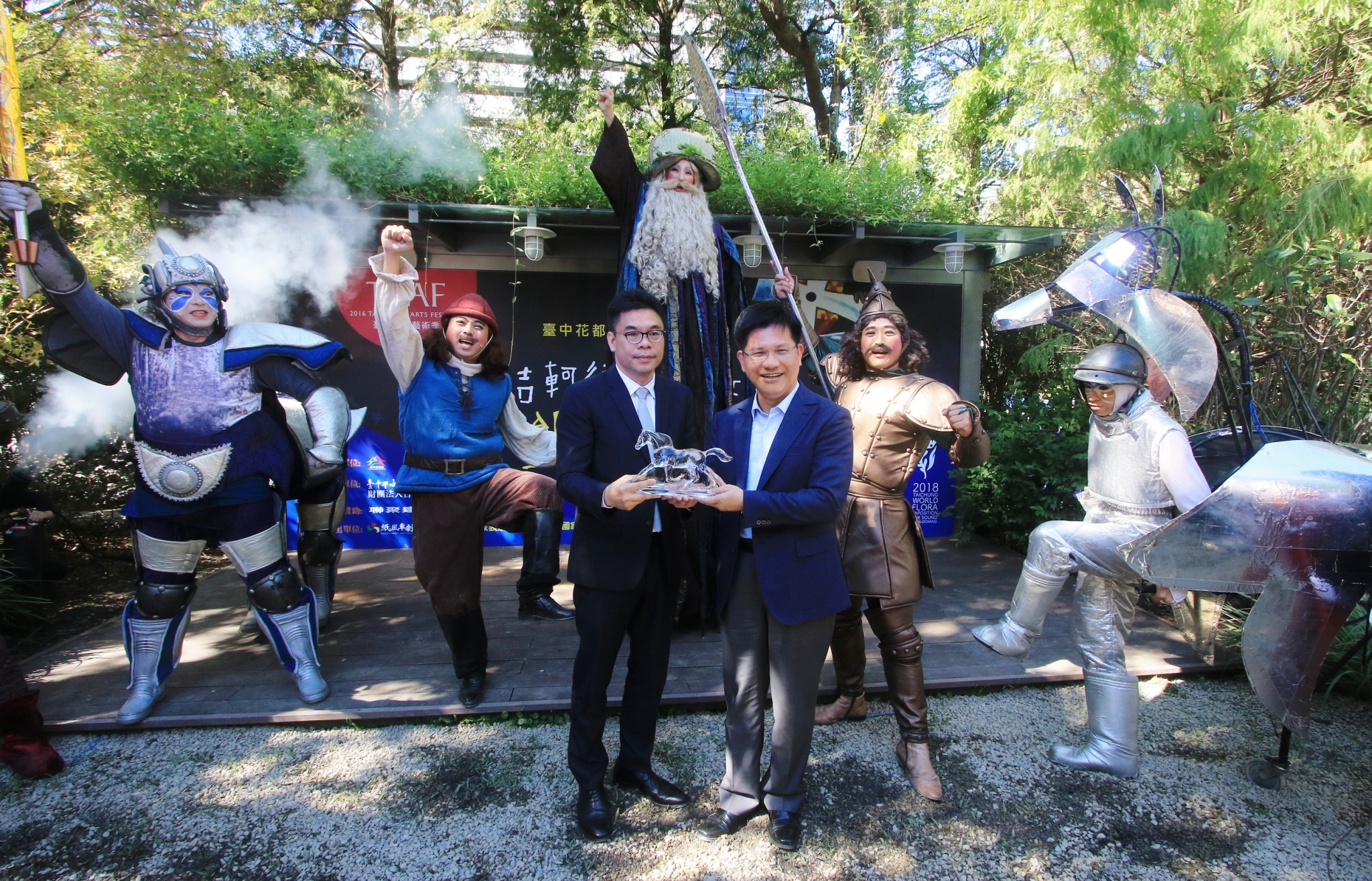 今日市府文化局在聯聚集團服務中心召開記者會,市長林佳龍、立法院副院長蔡其昌、聯聚集團董事長江韋侖、紙風車文教基金會執行長李永豐,與東勢區新成國小、中科國小、大肚區瑞峰國小等10餘所學校校長皆出席,劇中男主角唐吉軻德、隨從桑丘、時間老人、人馬天神也都一一現身,演出劇中橋段,讓眾人一飽眼福。