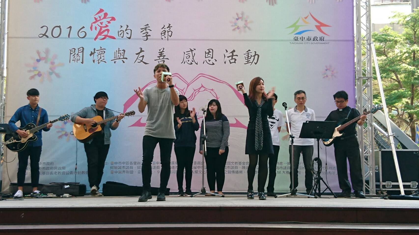 台中市政府民政局今(4)日在東協廣場舉辦「2016愛的季節—關懷與友善」感恩活動,有樂團表演、原住民歌舞、牧師祝福、移工交流、好禮相贈等多元內容,並有摸彩活動,希望讓來自東協的國際移工體驗台灣文化,同時感受台中人的熱情與温暖。市府民政局副局長盧政遠也出席,與民眾同樂。