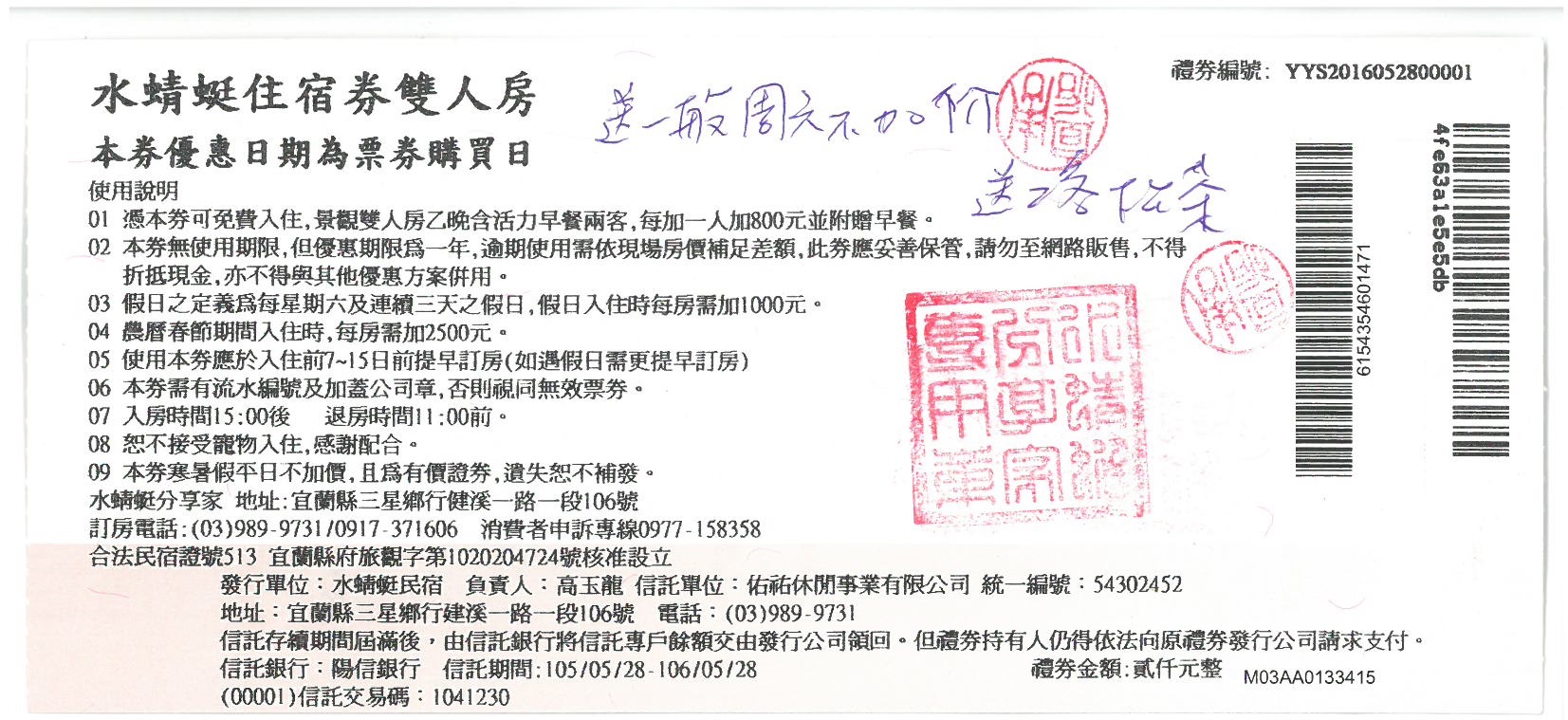 台中市政府消保官日前稽查旅展禮券時,發現匿名採購的宜蘭水蜻蜓民宿業者(佑祐休閒事業有限公司)住宿券未經使用,卻於信託銀行陽信商業銀行官網禮券信託查詢中,標示為已使用,恐影響該禮券的履約保證功能,損害消費者權益,經調查後,銀行已加強禮券勾稽機制,避免類似情事再發生。消保官呼籲購買水蜻蜓民宿禮券消費者,可至陽信銀行網站查詢禮券使用情形,如有不實,可向銀行或消保官反映,以保障自身權益。