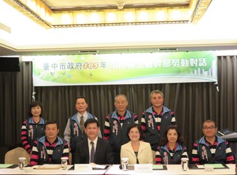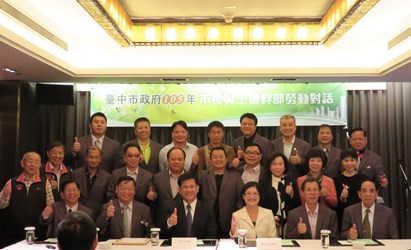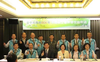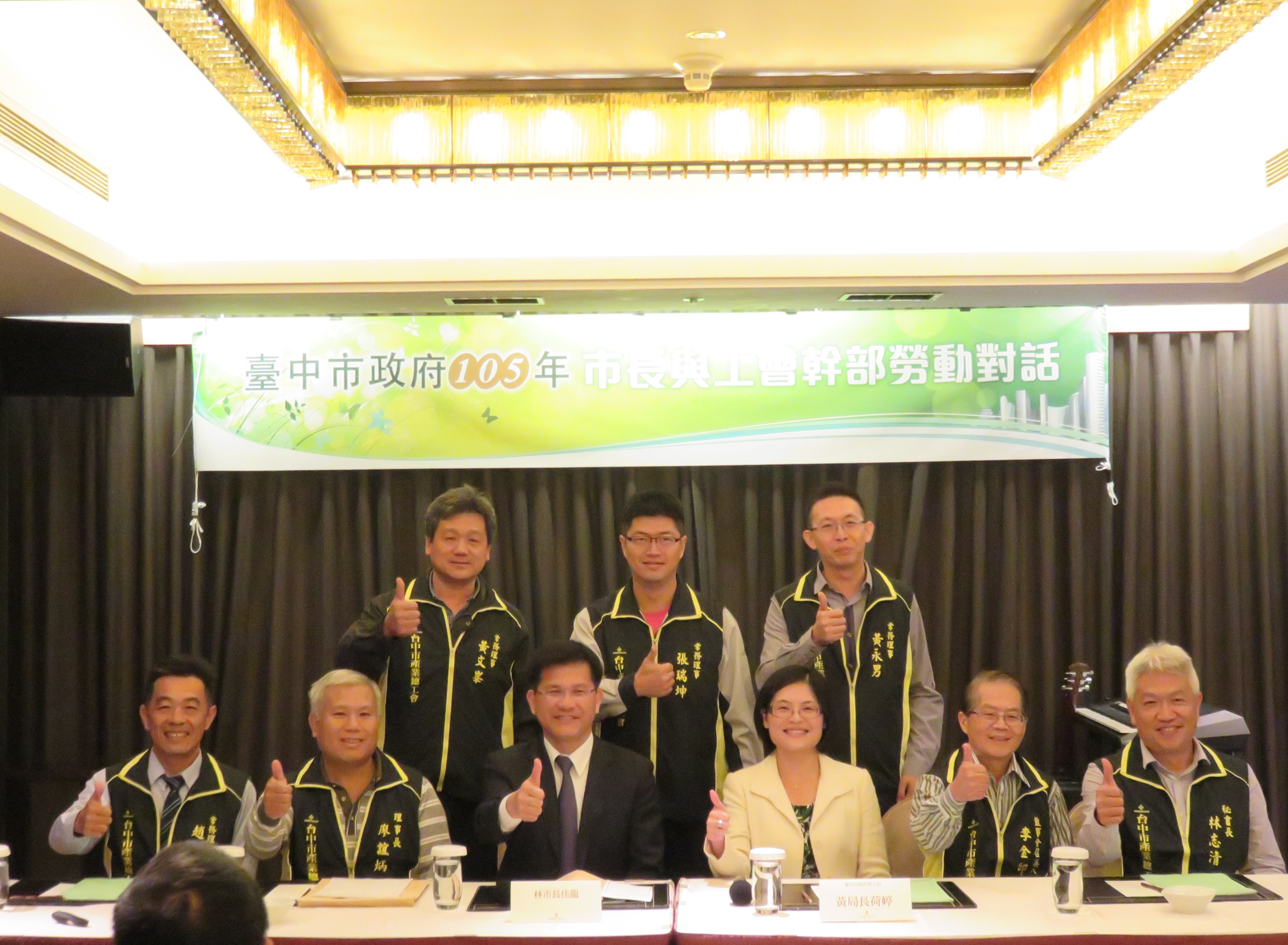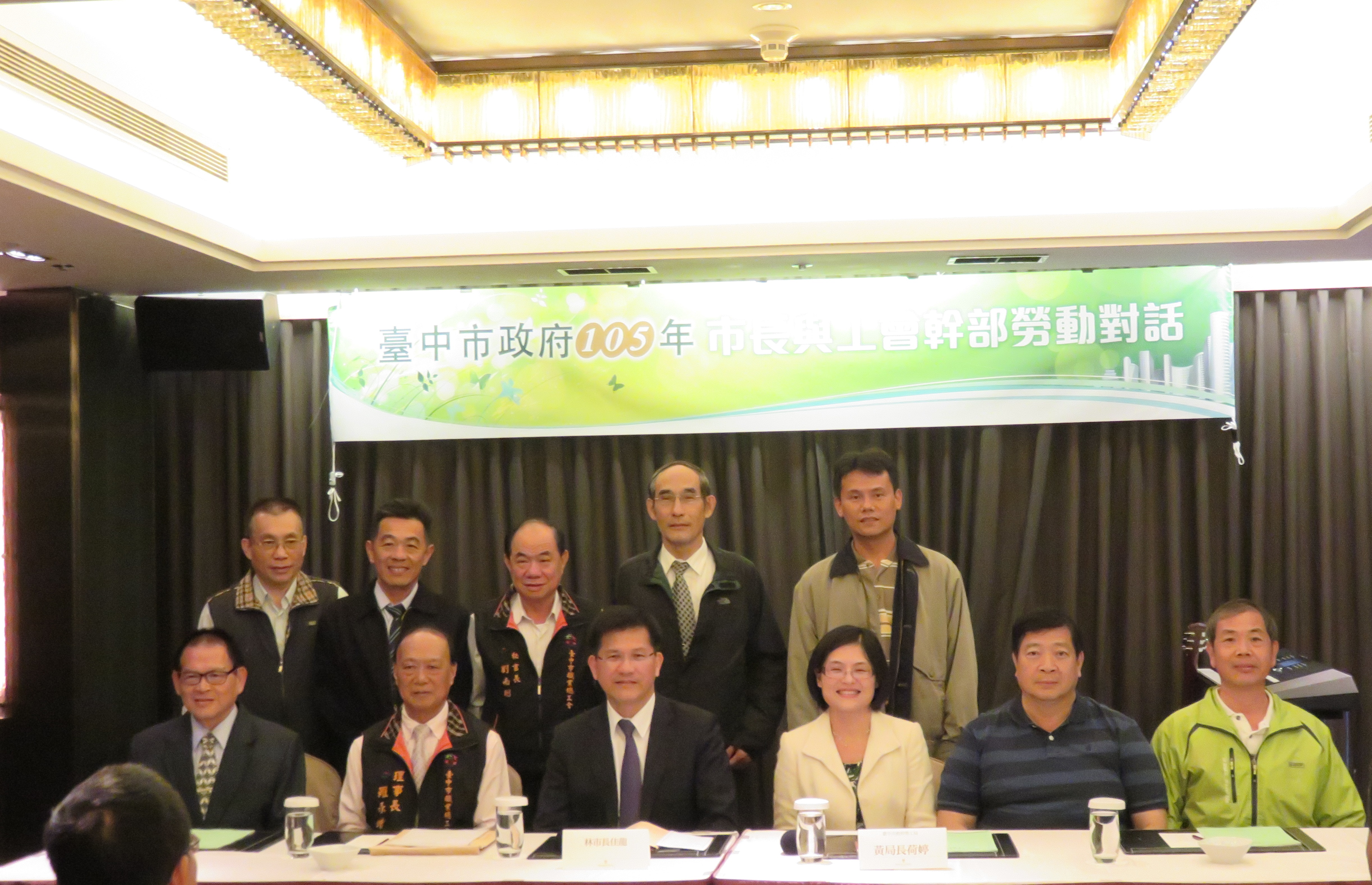 市府勞工局日前舉辦「105年市長與工會勞動對話」,由市長林佳龍率領勞工局長黃荷婷、環保局副局長吳東燿、都發局副局長紀英村、交通局主秘黃士哲、地稅局專委廖金龍等人,與台中市總工會理事長陳金源、台中直轄市總工會理事長花錦忠、台中市職業總工會理事長羅永增、大台中職業總工會理事長林蓮助、台中市產業總工會理事長廖誼炳等60多位勞工團體代表說明市府政策措施,希望聆聽勞工團體心聲,制定更符合勞工需求的政策。