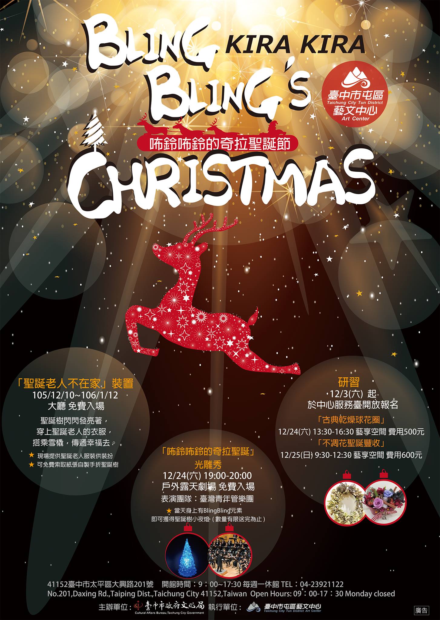 屯區藝文中心「聖誕老人不在家」裝置12月10日(六)至106年1月12日(四)在大廳展出,現場提供服裝裝扮聖誕老人與紙張可手折聖誕樹;「咘鈴咘鈴的奇拉聖誕」光雕秀於12月24日(六)19:00-20:00在戶外露天劇場由台灣青年管樂團現場演奏,只要穿著BlingBling就可索取聖誕小夜燈,活動免費入場!