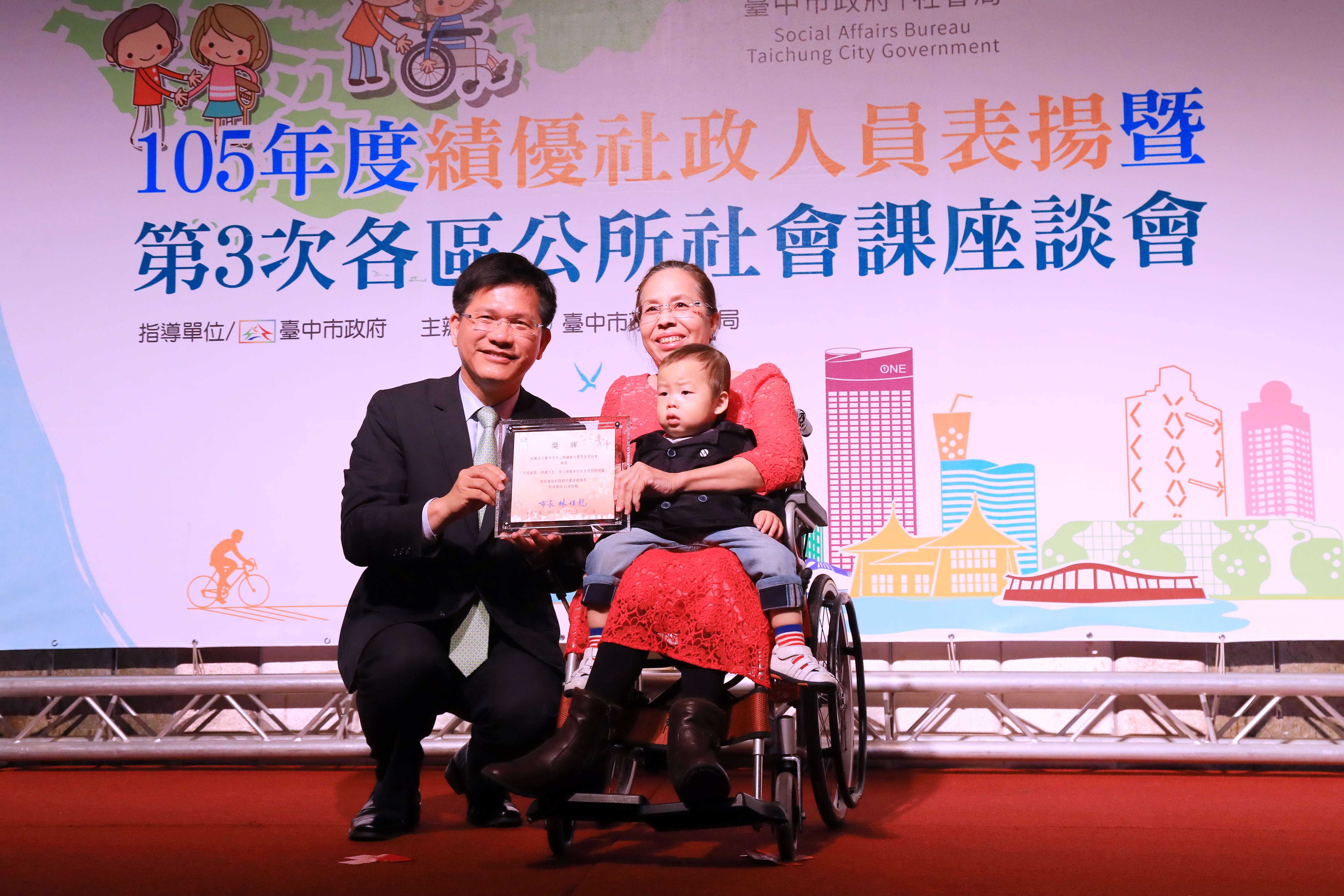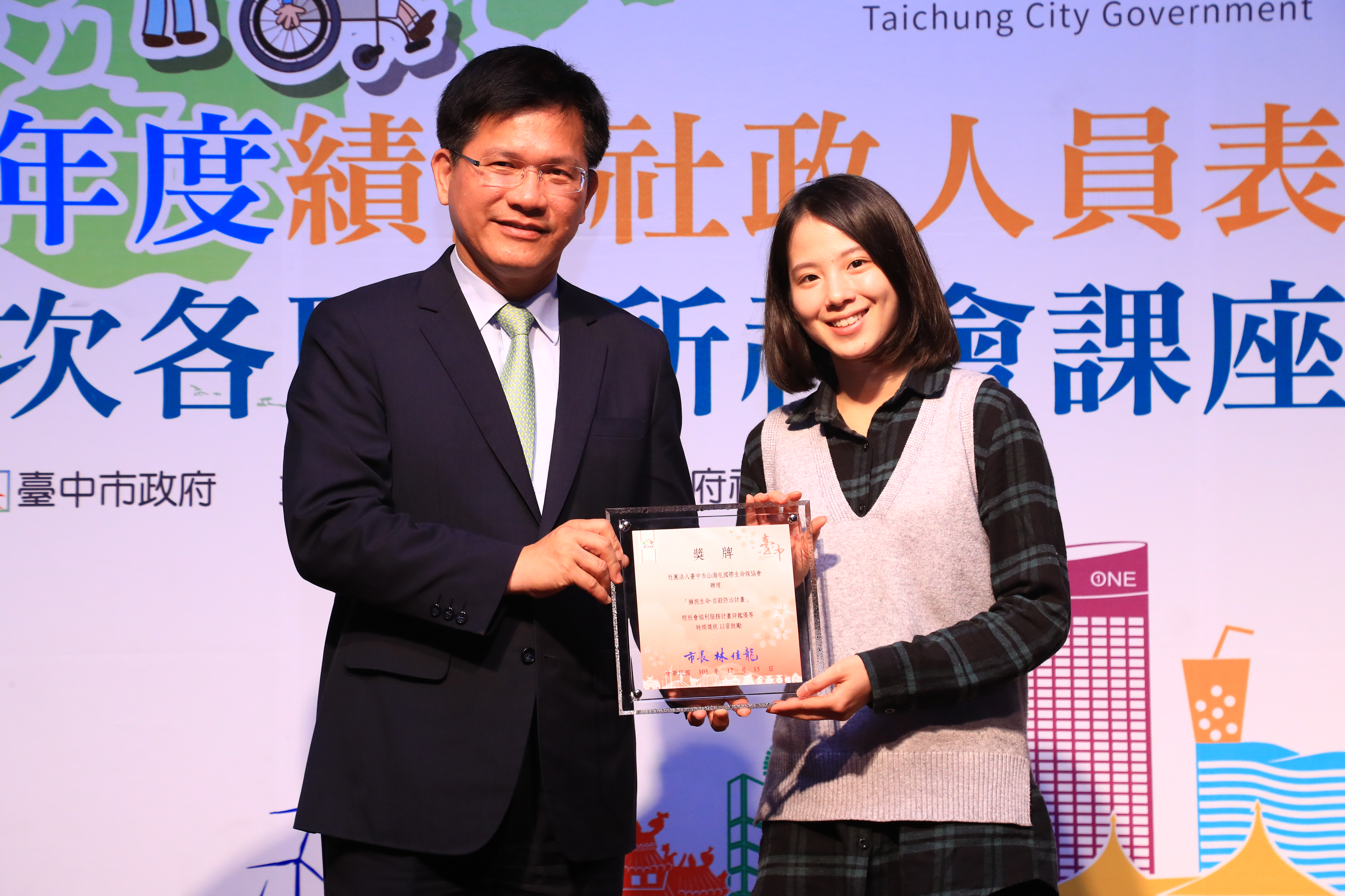 林市長表示,衛生福利部去年的社會福利績效考核中,台中市10項評比項目都獲特優佳績,感謝市府團隊及民間力量的付出,期待未來持續整合公部門及民間資源,提供以人為本的全能服務,並透過每一位社政人員,將中市的資源及福利送到需要者手中,關懷照顧。