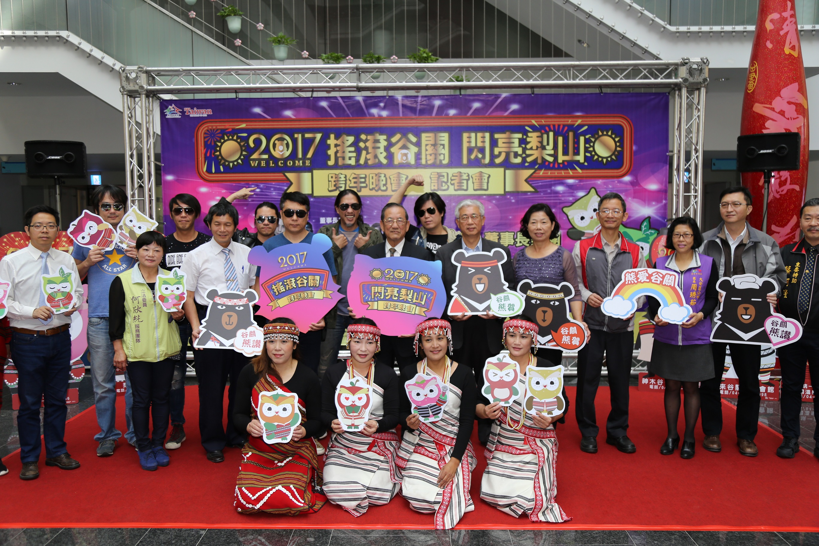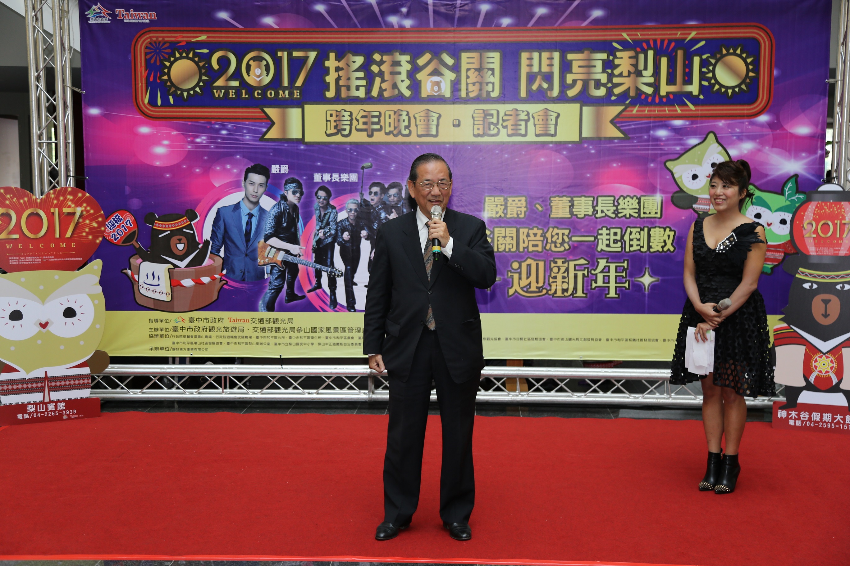 市府觀光旅遊局今(21)日舉辦「2017谷關梨山跨年活動」記者會,副市長林陵三在觀旅局長陳盛山的陪同下出席,包括市議員劉士州、劉淑蘭、交通部觀光局參山國家風景區管理處副處長廖錫標、大甲溪發電廠副廠長林瑞濱等人均共襄盛舉,晚會卡司之一的「董事長樂團」也到場為活動宣傳,氣氛活潑熱鬧。