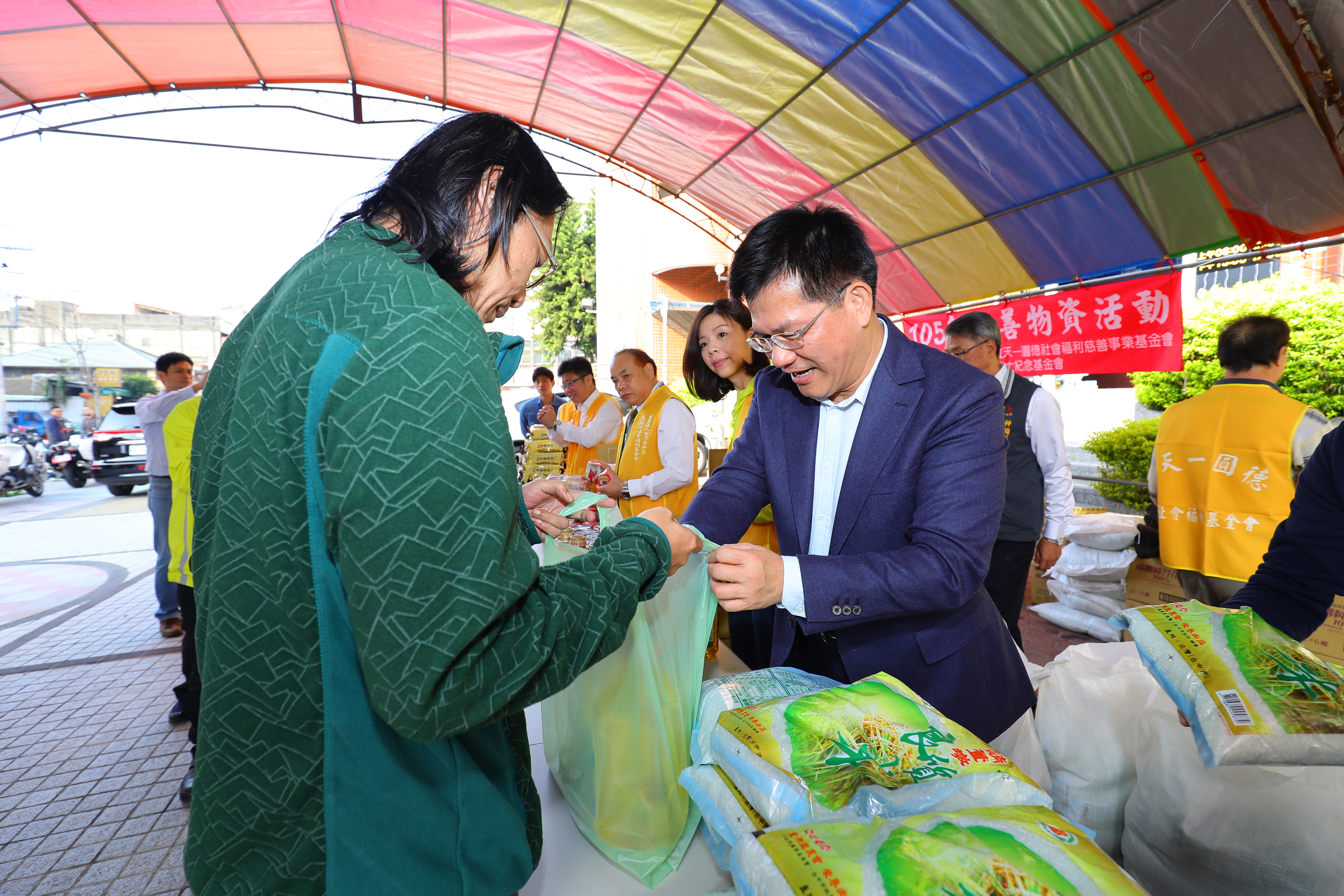 林市長今日上午在民政局長蔡世寅、社會局長呂建德等人陪同下到場發放物資,與市民寒暄問候,祝福大家平安健康。立委洪慈庸也到場協助發放,關懷弱勢團體家境狀況,盼集合社會暖暖的愛心與關懷,讓弱勢團體度過寒冬,歡度即將到來的農曆春節。