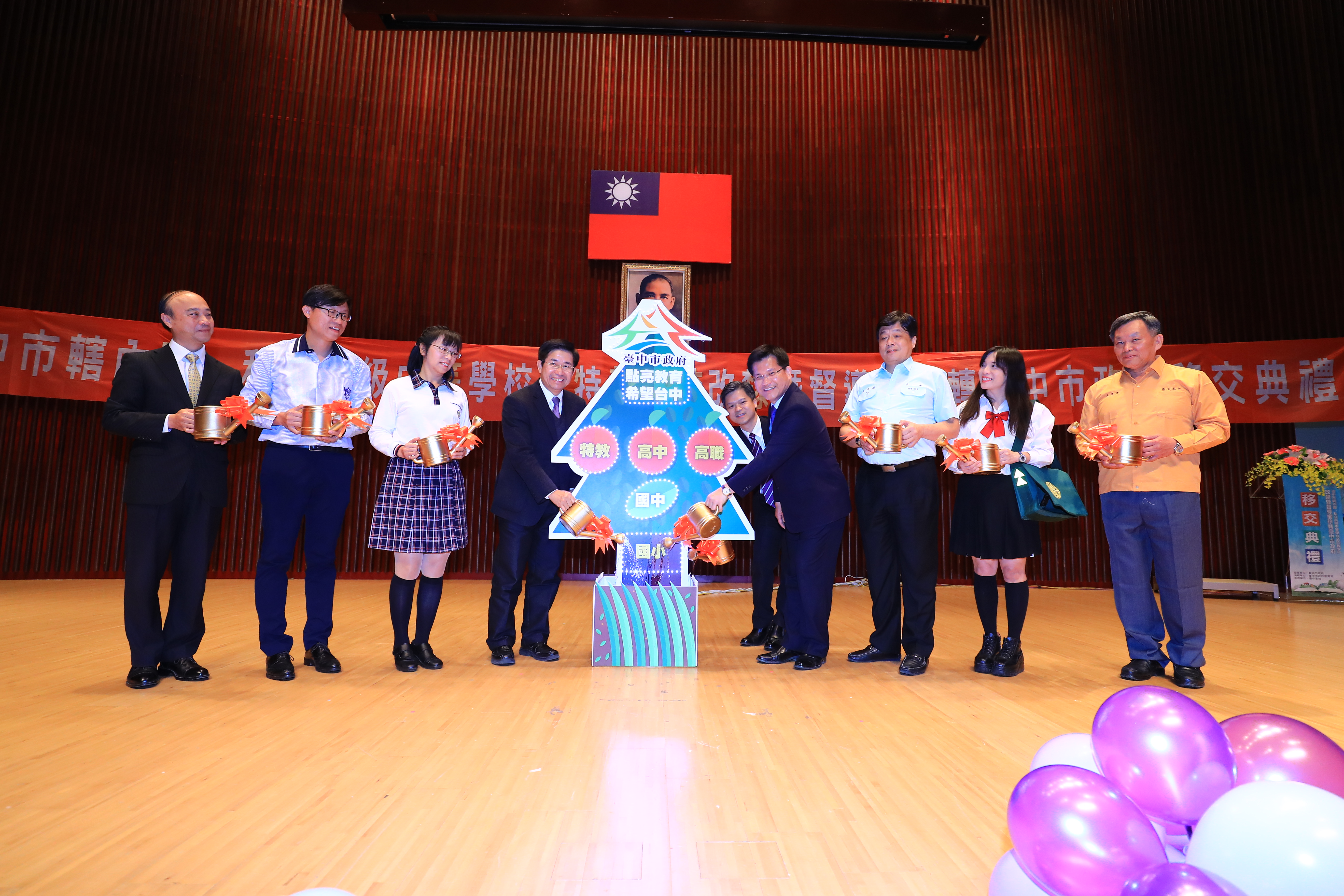 今日的典禮由台中市長林佳龍、教育部長潘文忠主持,林市長親自致贈刻有「薪火相傳」的紀念品給潘部長,並逐一布達各改隸的校長,與致贈紀念品給包括台中一中校長陳木柱在內的17所國立與22所私立高中職校長,最後邀請國小、國中、特教、高中、高職校長代表,手持一同澆花器澆灌台中的教育,點亮教育的希望之樹,包括市議員何敏誠、劉淑蘭等人都親自到場見證。