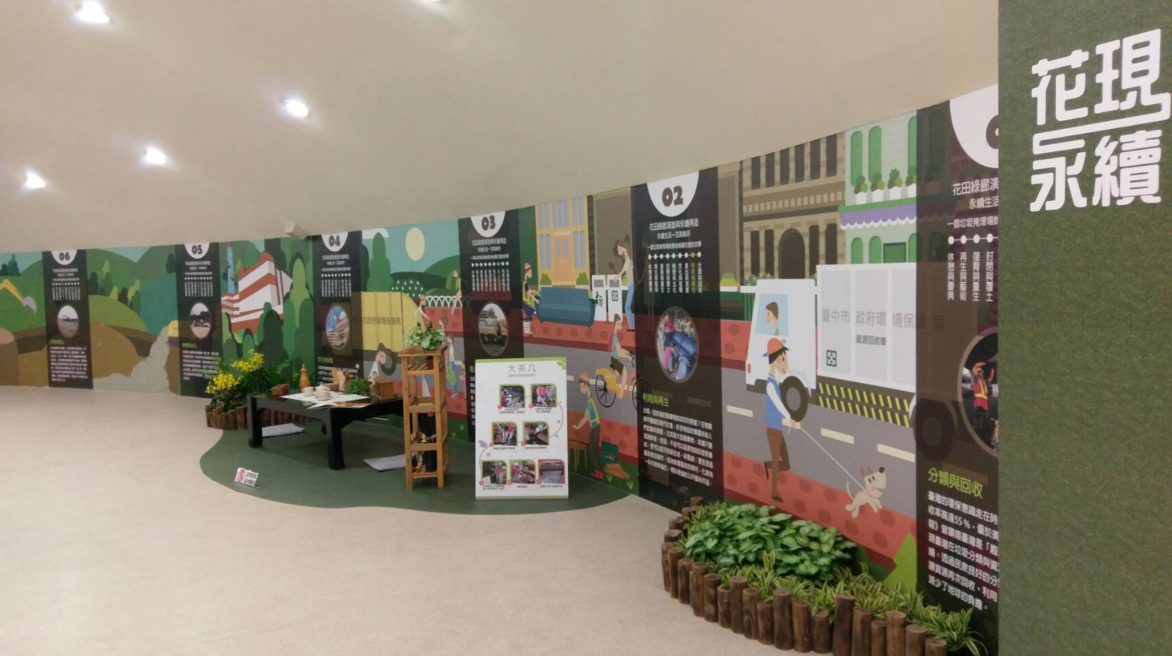 為替2018台中世界花博暖身,2016國際花毯節特別移師花田綠廊舉辦,同時環保局也在旅客服務中心1樓規劃「花現永續」特展,介紹垃圾掩埋場成為環保公園的整建復育過程,包括分類與回收、利用與再生、產出與清運、焚化與發電、掩埋與去化、封閉與覆土、復育與重生等七大過程。