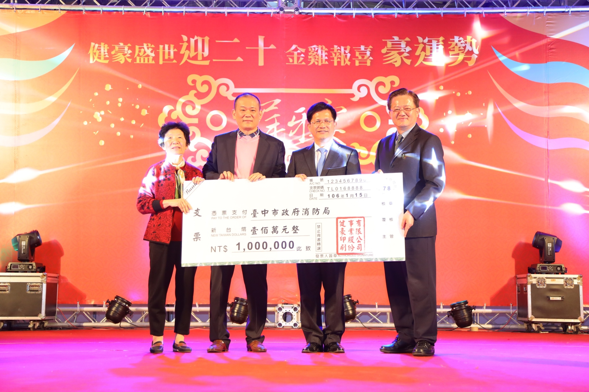 林市長今日出席該公司尾牙代表授贈,並回贈感謝狀;他說,健豪印刷不僅事業有成,也不忘企業社會責任,秉持「取之於社會、用之於社會」的理念,長年支持中市消防救災工作。