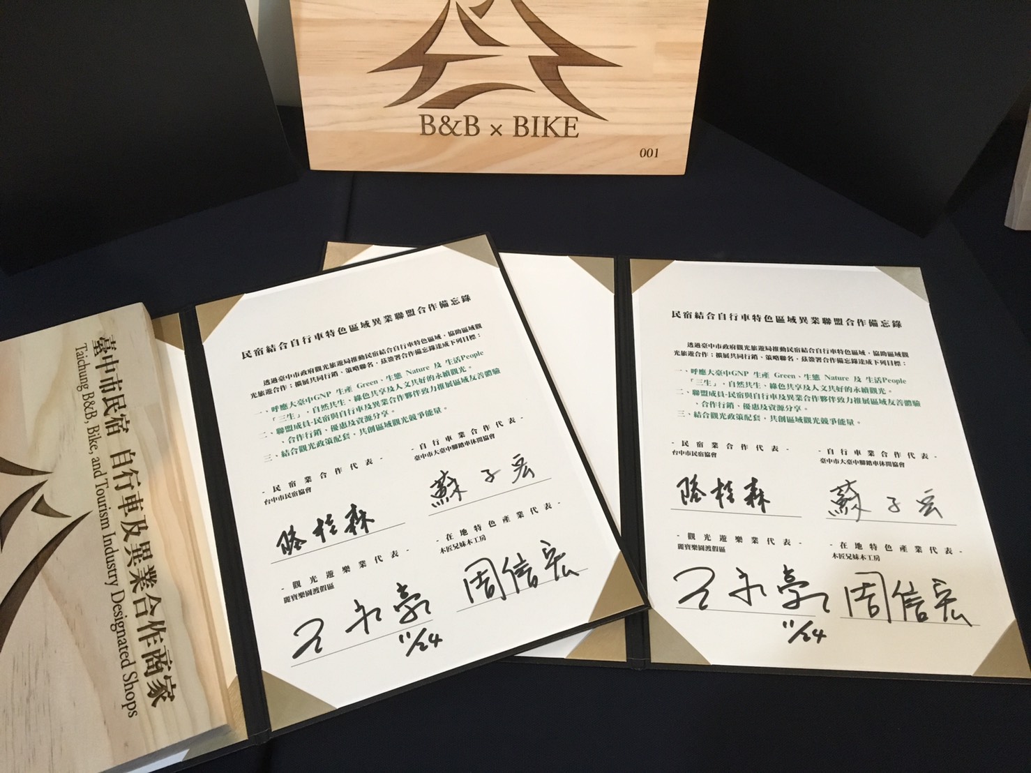 今日的成果發表會,邀集許多台中民宿、自行車、觀光遊樂業、旅行社、區域產業聯盟等代表參加,在市府觀光旅遊局長陳盛山的見證下,由台中市民宿協會理事長陸桂森、台中市大台中腳踏車休閒協會理事長蘇子宏、麗寶樂園園長王永豪、后里區產業聯盟業者代表「木匠兄妹」經理呂權晏等人代表所有合作業者,共同簽署異業合作備忘錄,推出各種不同優惠方案與套裝優惠遊程,提供遊客多樣選擇。