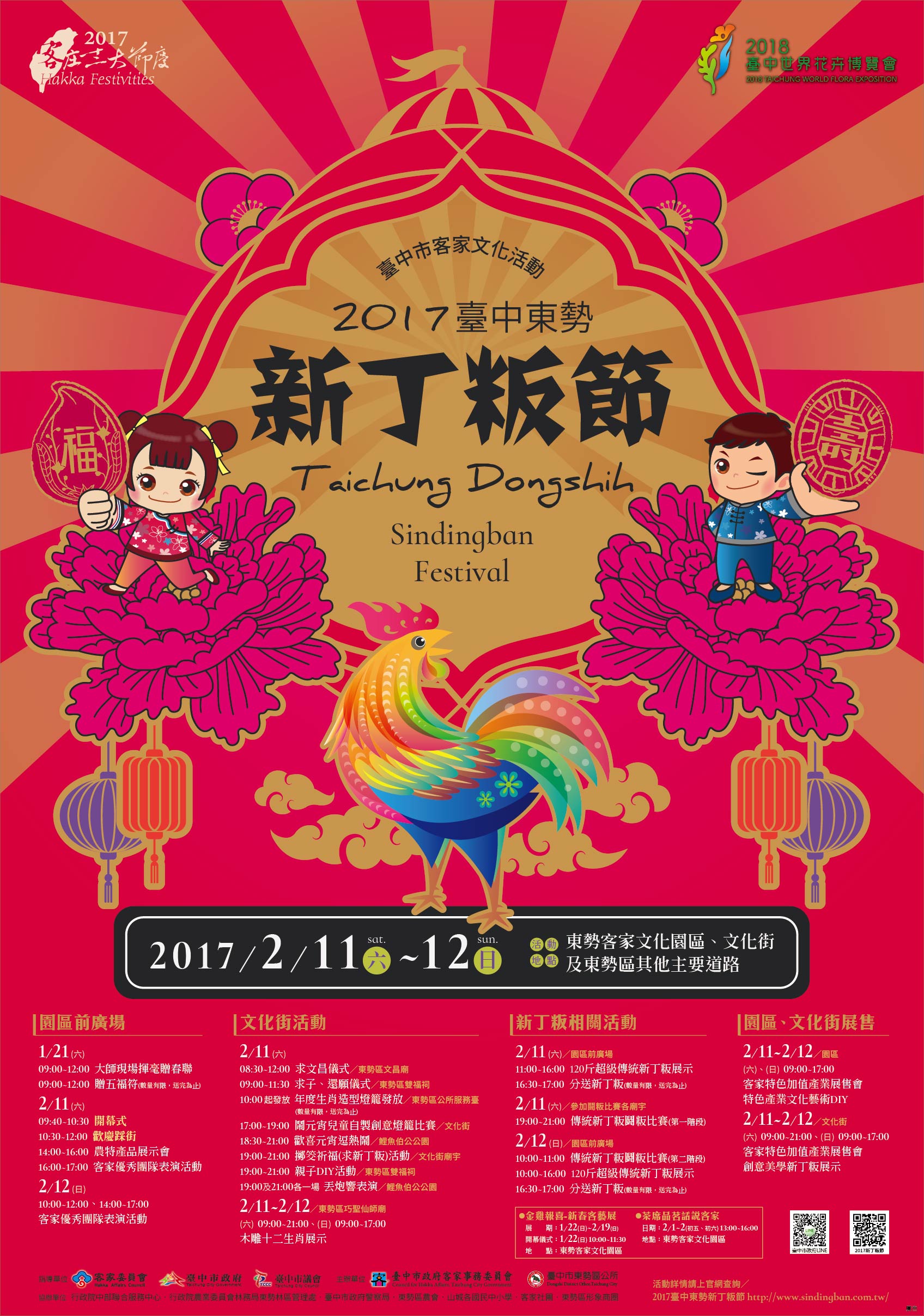 「台中東勢新丁粄節」過去已連續多年獲得客家委員會列入「客庄12大節慶」的全國性活動,台中市政府客家事務委員會規劃「2017台中東勢新丁粄節」系列活動,又再度獲選為「客庄12大節慶」之一,將於2月11日至12日熱鬧登場。週六(11日)上午歡慶踩街活動將有結合客家社團、學校學生、社會青年組成精彩的踩街隊伍展現活力,不但有苗栗、彰化等縣市組團參與,日本鳥取縣也將組團來台共襄盛舉。