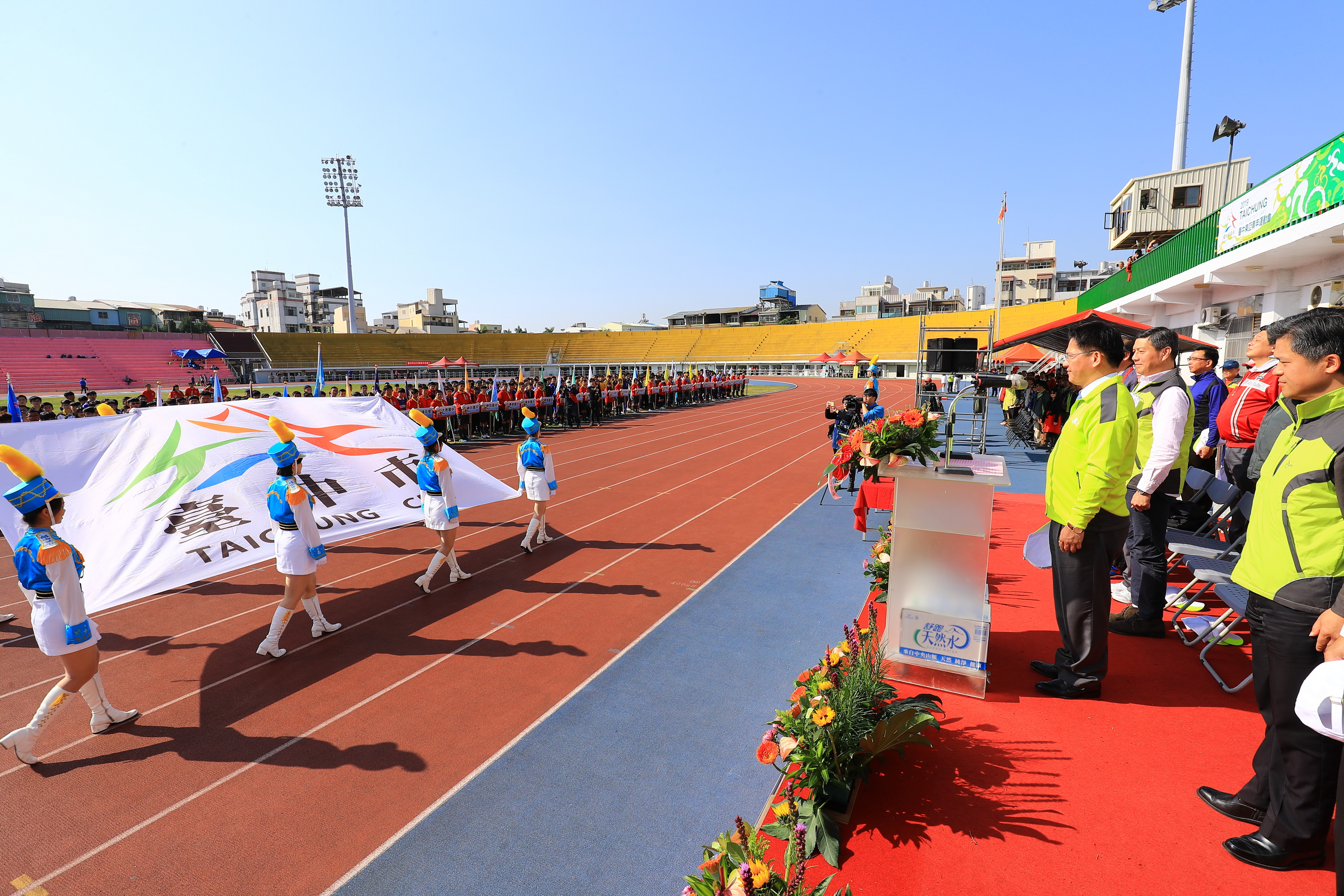 今日開幕典禮包括林市長、市府教育局長彭富源、顧問王岳彬、體育處長郭明洲、立法院副院長蔡其昌服務處代表、市議員翁美春、市議員陳成添、陳政顯服務處代表、台中市體育總會秘書長楊永昌、多位校長等人都到場參加,為參賽選手加油打氣。