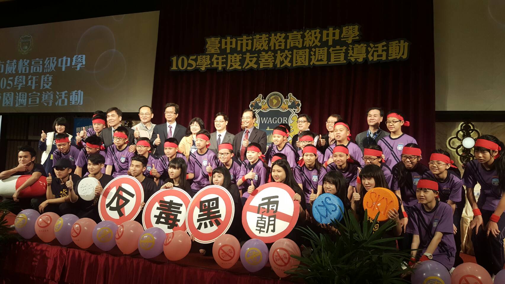 今日宣導活動,包括教育局劉副局長、葳格高中校長許焴楨、家長會長余有發等人,都和學生分享友善校園觀念,並由劉副局長帶領師生共同宣誓「反毒、反黑、反霸凌」,刺破象徵這三種危害的氣球,期許營造健康、和諧、友善校園。