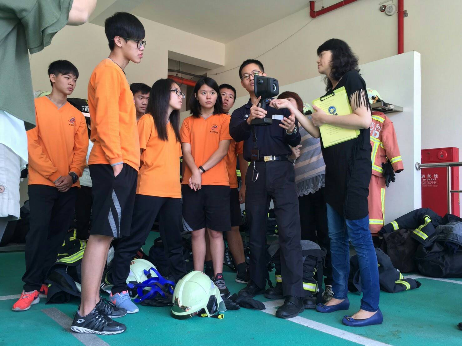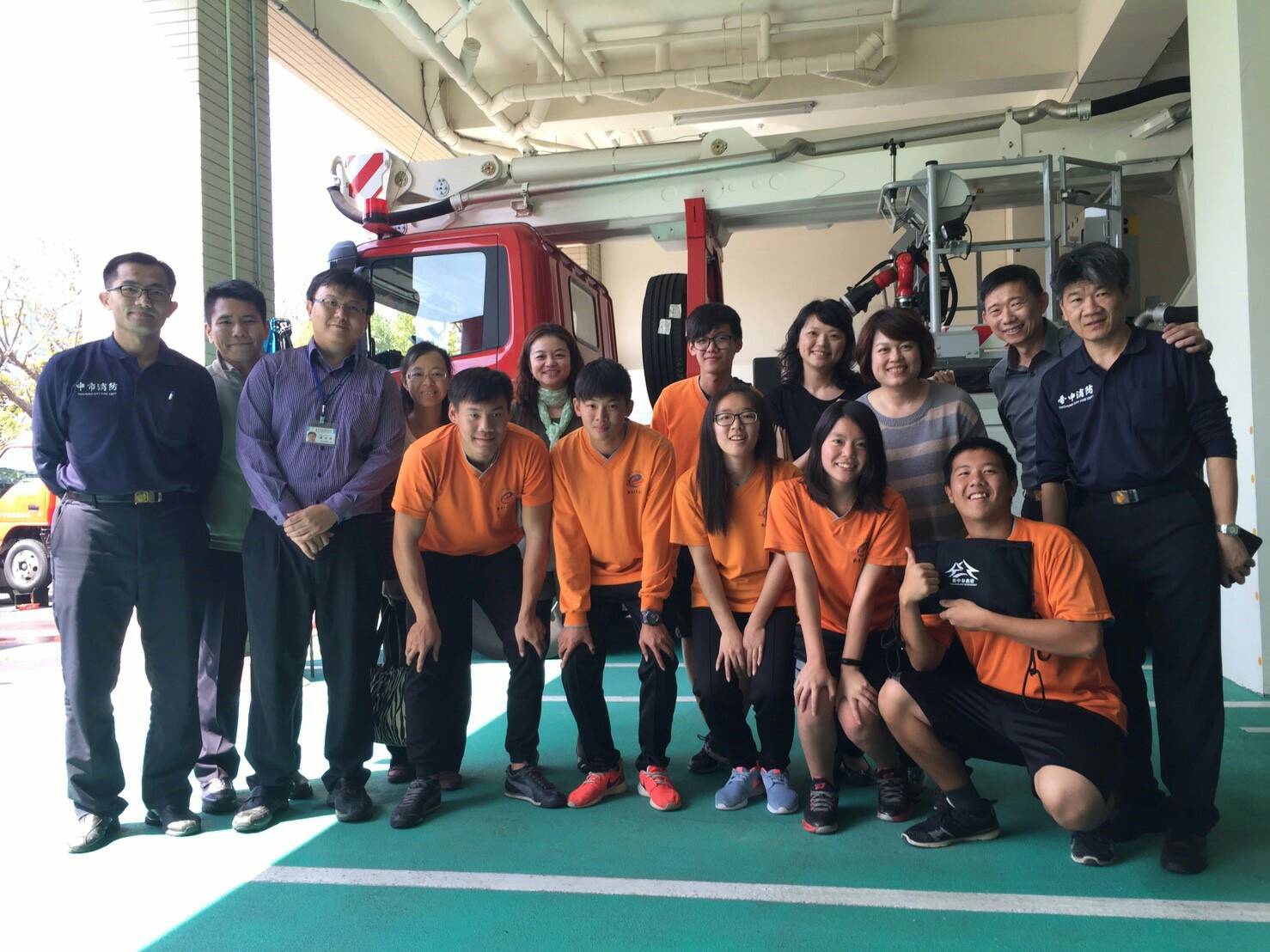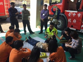 消防局講師為同學們介紹消防員的生活作息,並實際帶領學生進入值班台,當時值班台正巧接獲救護通報,目睹救護人員出勤的過程。此外,消防局也安排CPR課程、射水體驗、並試著消防裝備爬樓梯等,讓學生了解消防工作的輪廓。參訪過程中,雙方互動熱烈,同學對於消防人員的勤休制度、出勤規定、消防裝備器材汰換、女性消防員工作內容等問題都感到好奇,講師皆一一耐心說明。
