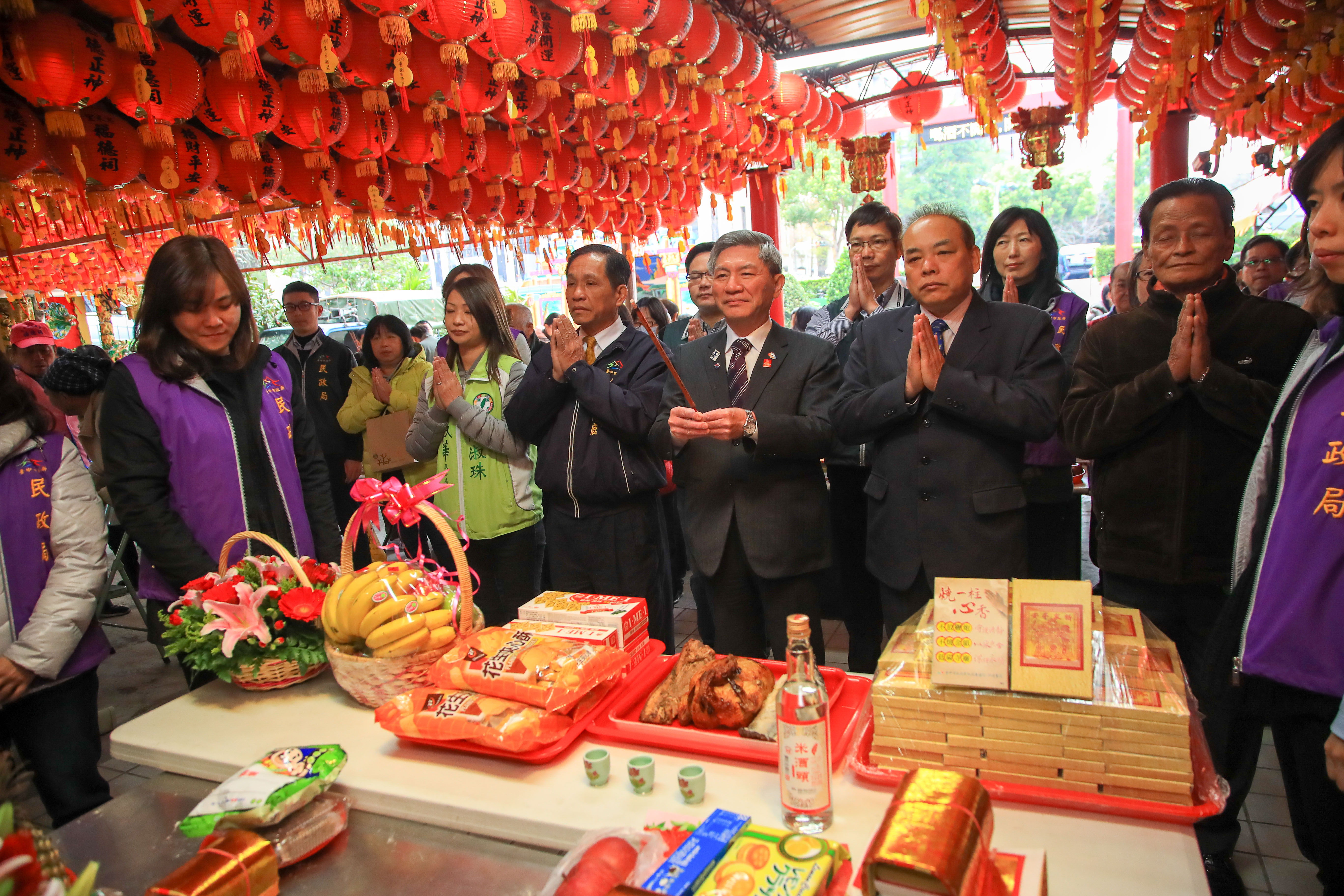 市府團隊今日由副市長張光瑤主祭,民政局長蔡世寅、西屯區副區長林秋萬、惠來里長廖慶麟、惠來里福德祠主委陳正雄陪祭,為土地公獻禮;立委張廖萬堅也前往關心。